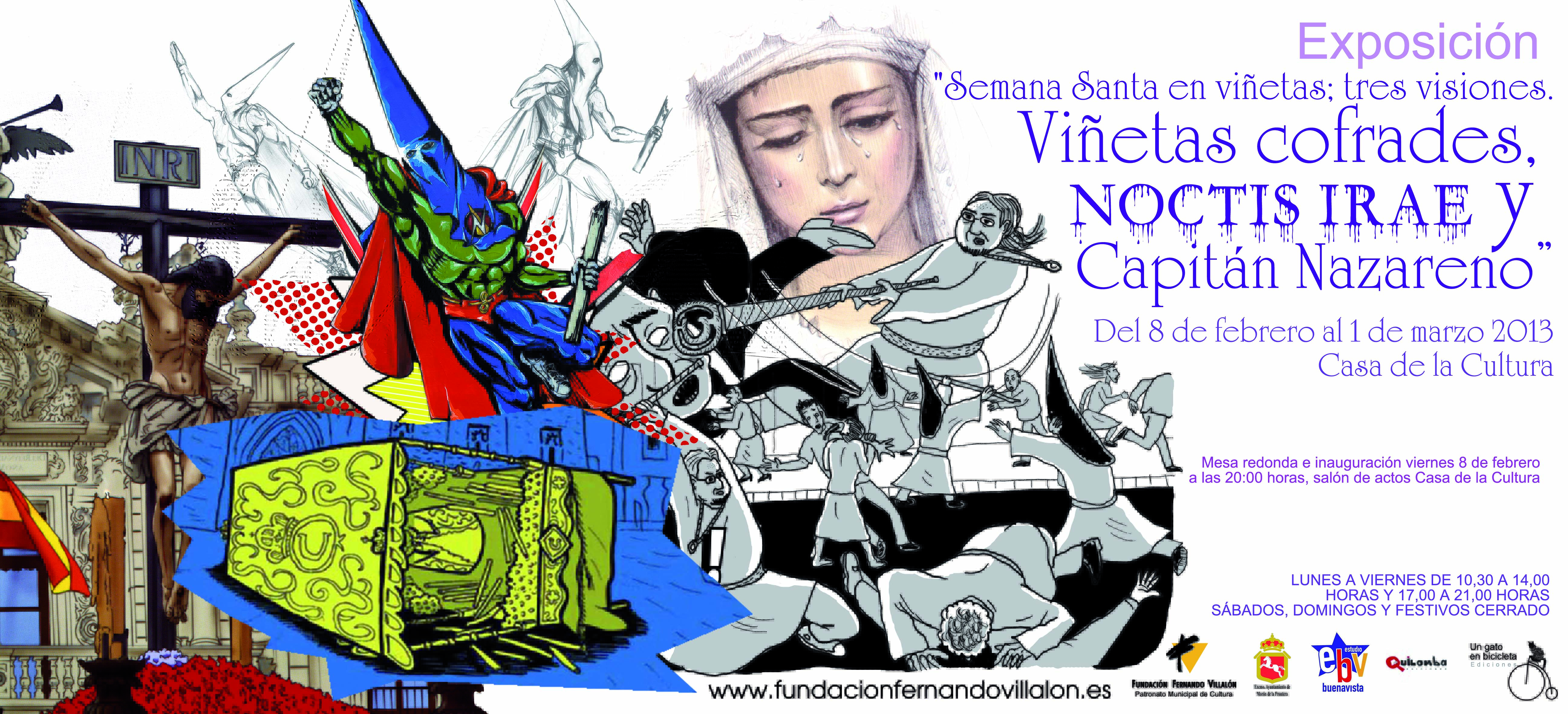 ¿Qué tienen en común un superhéroe con capirote (Capitán Nazareno), las tradiciones de la semana santa a través del cómic (Viñetas Cofrades) y la historia de una antigua maldición zombi que siembra el …caos en la madrugá (Noctis Irae)? Habrá que descubrirlo, y para ello planteamos esta exposición con bocetos, dibujos y piezas de arte final de las tres publicaciones, además de una mesa redonda que dará comienzo a la muestra.