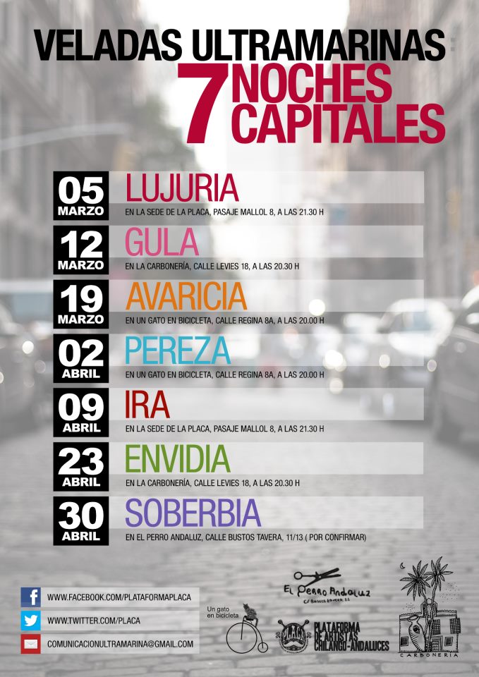 La promotora de esta idea es la Editorial Ultramarina, Cartonera & Digital, que ya presentó la velada dedicada a la Lujuria el pasado martes 5 de marzo en la sede de la PLACA que no es otra cosa que la Plataforma de Artistas Chilango-Andaluces.