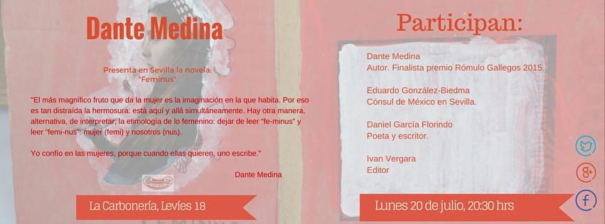 Contaremos con la presencia del autor, el Escritor Dante Medina; el Cónsul de México en Sevilla: Eduardo Gonzalez-Biedma; Daniel García Florindo, poera y escritor sevillano, así como el editor Ivan Vergara Web