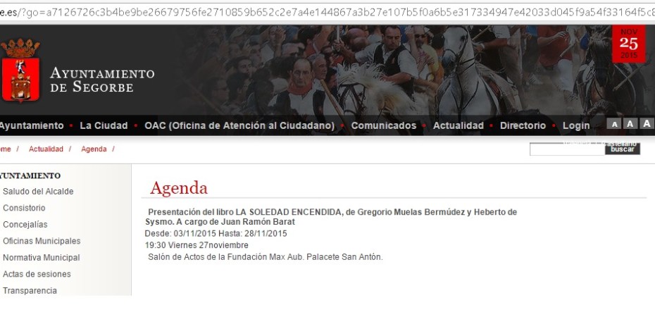 El Ayuntamiento de Segorbe recoge en su agenda la presentación de «La soledad encendida», Ultramarina Cartonera, en la Fundación Max Aub. Será el próximo viernes día 27, a las 19.30 horas. Poesia Heberto de Sysmo y un servidor tendremos el honor de estar acompañados por Juan Ramón Barat, que comentará aspectos muy interesantes sobre el poemario, y Soledad Benages, que recitará una selección de haikus del libro.