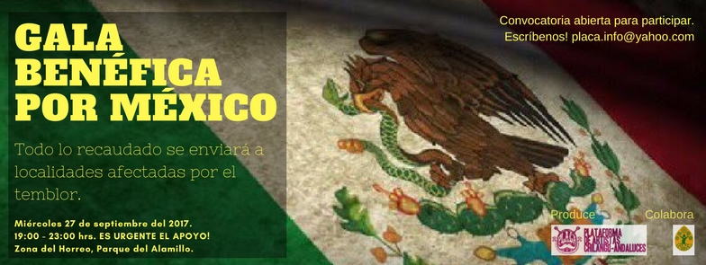 Desde la PLACA Plataforma de Artistas Chilango Andaluces estamos organizando una Gala Benéfica que ayude a recaudar dinero para enviar a ciudades y pueblos de México afectados por el temblor.