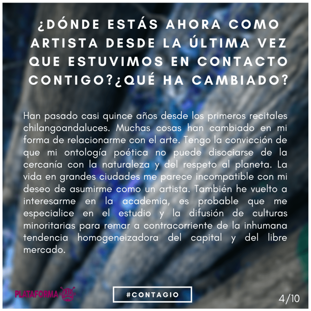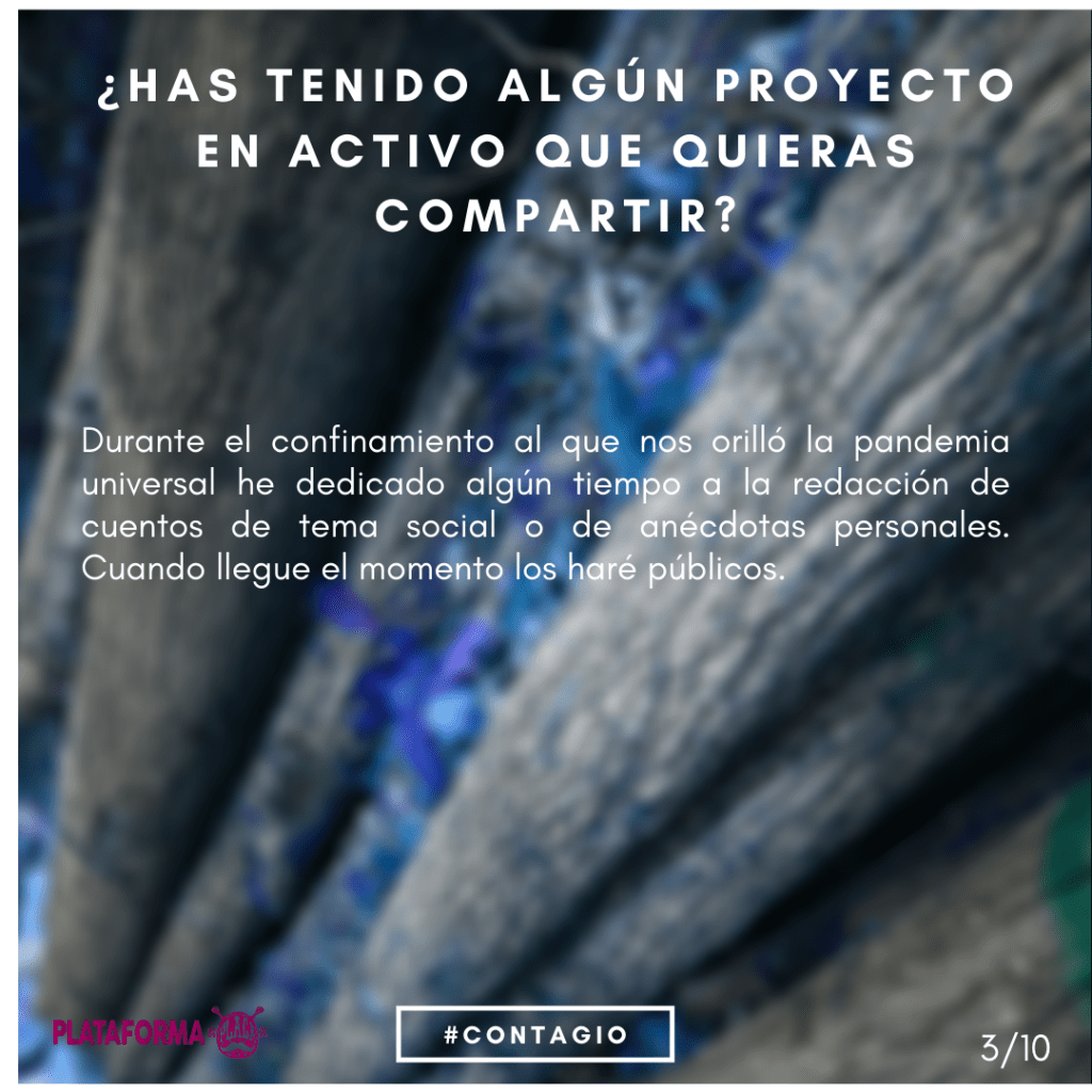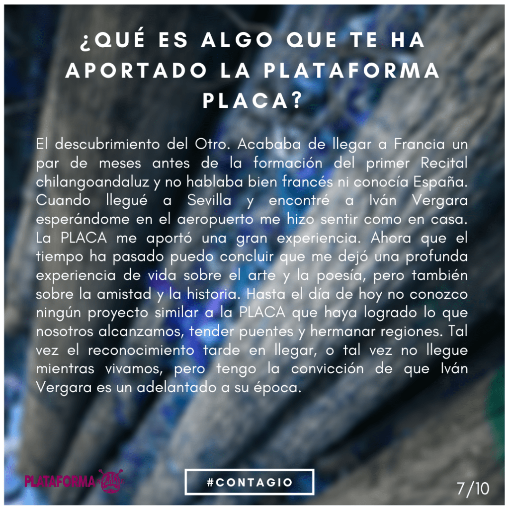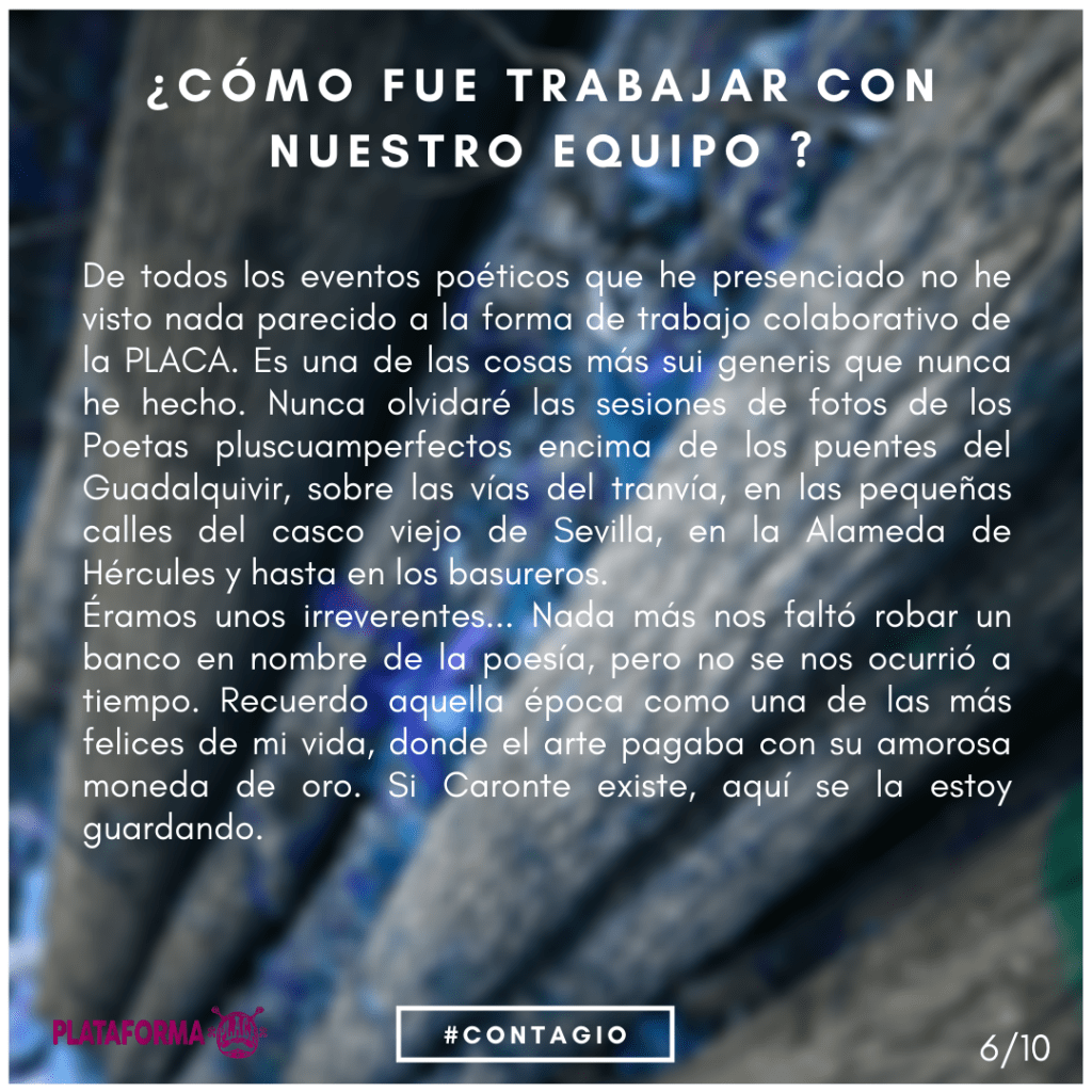 Todos los protagonistas de los proyectos culturales de la #PlataformaPLACA son quienes han puesto su tiempo, obra y deseo para mostrar su creatividad y tender puentes con el oyente, espectador o lector. Queremos que nos hablen, que vuelvan atrás un poco la memoria y compartan con nosotros alguna de sus experiencias e ideas en torno a la actividad generada durante los eventos y todo lo que sucedió después, queremos ahondar en entornos poéticos creados. Recordar de dónde venimos.