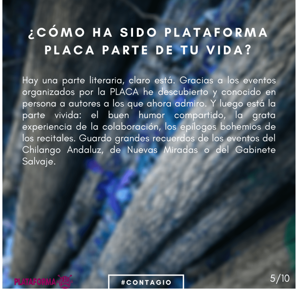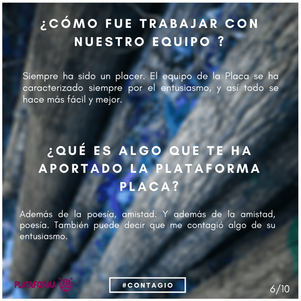 Todos los protagonistas de los proyectos culturales de la #PlataformaPLACA son quienes han puesto su tiempo, obra y deseo para mostrar su creatividad y tender puentes con el oyente, espectador o lector. Queremos que nos hablen, que vuelvan atrás un poco la memoria y compartan con nosotros alguna de sus experiencias e ideas en torno a la actividad generada durante los eventos y todo lo que sucedió después, queremos ahondar en entornos poéticos creados. Recordar de dónde venimos.