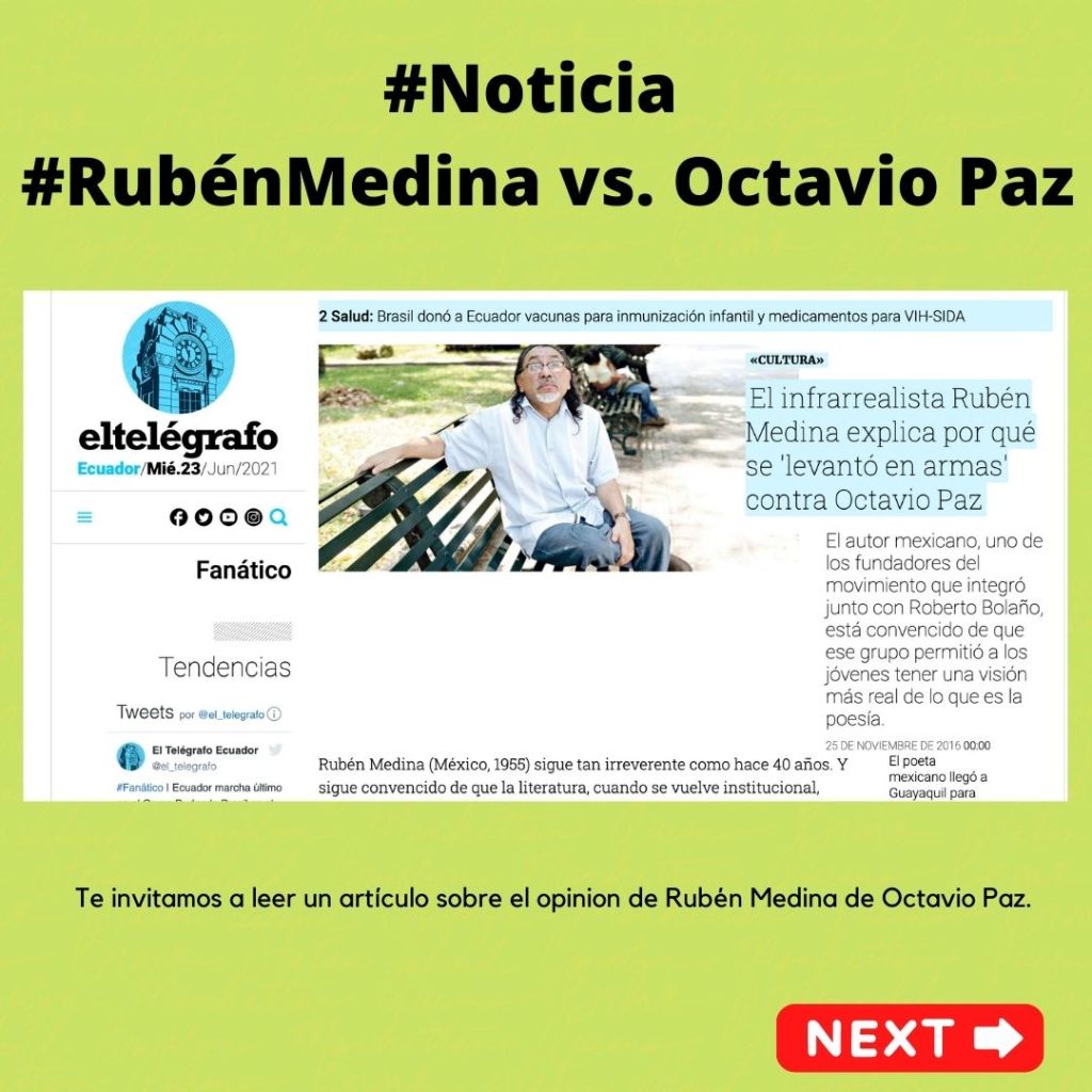 The infrarealist, Rubén Medina, explains why he ‘raises arms” in contrast to Octavio Paz. Check it out by using this link: https://www.eltelegrafo.com.ec/noticias/cultura/7/el-infrarrealista-ruben-medina-explica-por-que-se-levanto-en-armas-contra-octavio-paz
