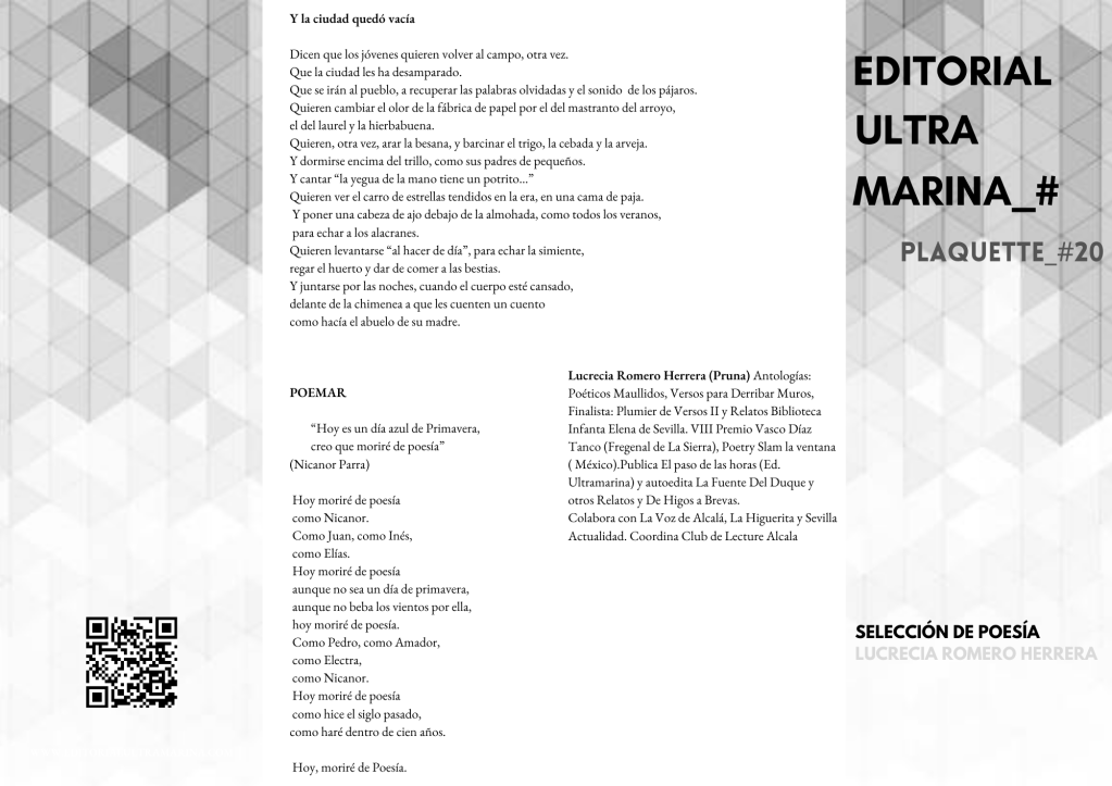 Cada uno de lo ejemplares cartoneros de la Editorial Ultramarina lleva dentro una #PlaquetteUltramarina de regalo, los autores son de diversos países del mundo hispano, que por su calidad poética consideramos adecuada para difundir a través de nuestro proyecto.