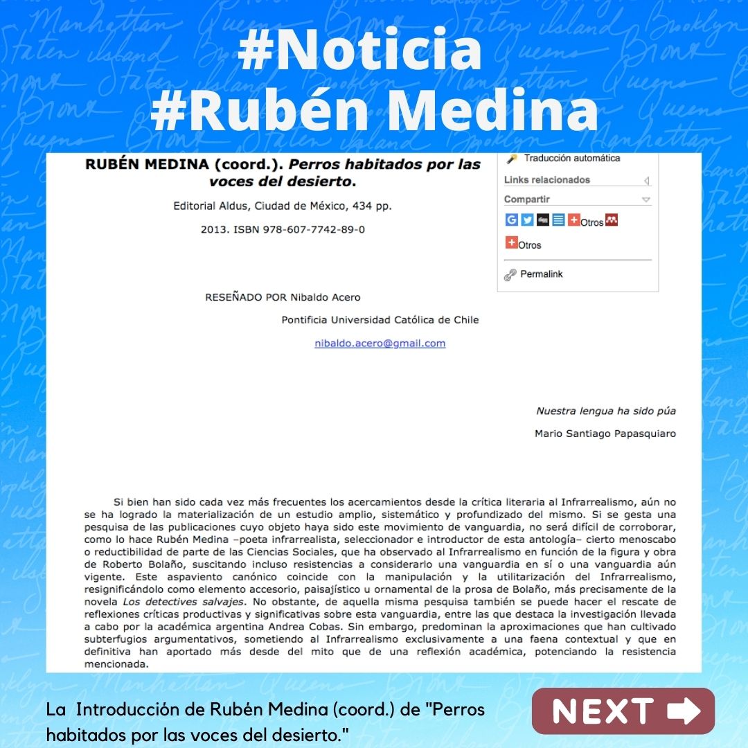 Les invitamos a leer la introducción de la novela nueva se llama “Perros habitados por las voces del desierto.” Es una antología a cargo de Rubén Medina que reúne 19 escritores con la movimiento Infrarrealista.