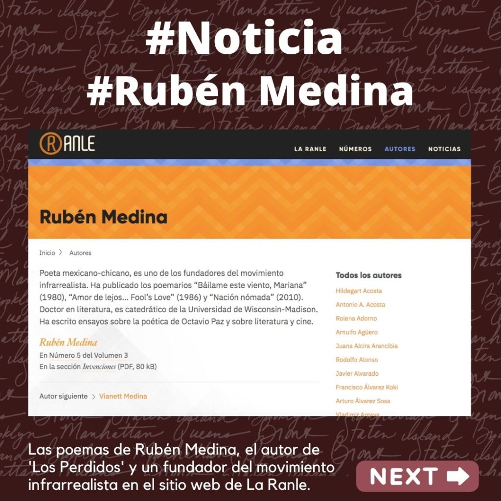 Les invitamos a visitar el sitio web de La Ranle para ver las poemas de Ruben Medina, el autor de ‘Los perdidos’ y un fundador del movimiento infrarrealista.