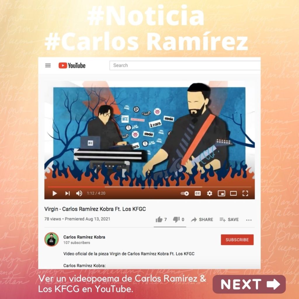 Les invitamos a mirar ‘Virgin,’ un videopoema de Carlos Ramírez Kobra y Los KFCG. Es una combinación magnífica de música, palabras, y imagenes hermosas!! Para comprar la novela de Carlos Ramírez Kobra ‘Own dream code’, dale aquí!