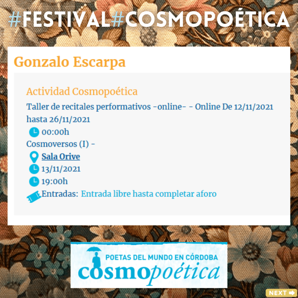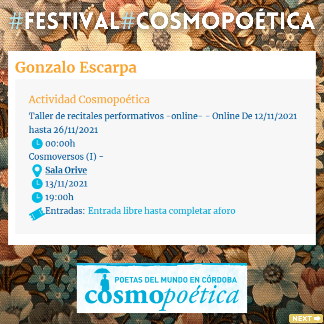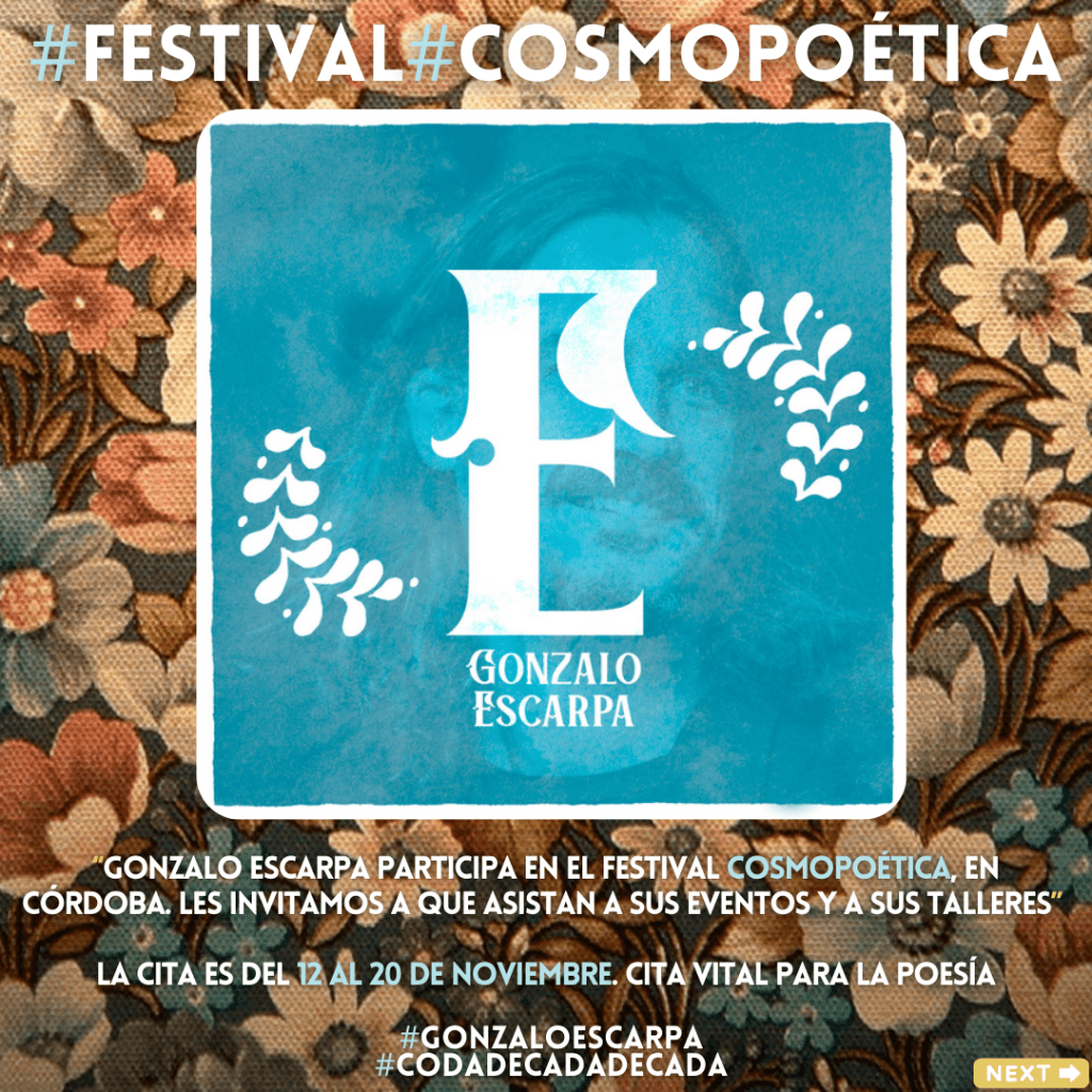 Grandes noticias #Escarpers! compartimos noticias del muro de Gonzalo: "Cosmopoética es un maravilloso festival que pone a córdoba entera a bailar poemas. cuenta además con varios talleres poderosos sobre diferentes aspectos de la creación poética. tengo el placer de ofrecer por primera vez "palabra-escena-acción", un curso online sobre lecturas poéticas performativas. llámalo poesía viva, poesía escénica o perfopoesía: se trata de construir una atmósfera poética en la escena, o una atmósfera escénica en el poema. del 12 al 26 de noviembre, soy todx vuestrx.inscripción hasta el día 8, no te lo pienses." TODA LA INFORMACIÓN AQUÍ - https://www.cosmopoetica.es/actividad/taller-de-recitales-performativos-online?fbclid=IwAR0j79ofTKEA_oEp_2BLJA1QN4OMGIOa2jxc3MQDdq3BpCGPr0mlCXrFWj8 Mucha suerte, Gonz! Distribución internacional de #Codadecadadecada ¿Dónde conseguirlo? España: Librerías por AZ Distribuidora / editorialultramarina@gmail.com Whatsapp +34 644 78 88 64 USA - https://ultramarina-us.quares.es/apex/quares/r/landingweb/detalle-producto?p2_id=15178&session=5750940557495 México - https://www.elsotano.com/libro/coda-de-una-decada-antologia-poetica_10601656 www.editorialultramarina.com La mejor poesía & literatura independiente de ultramarMéxico - España - USA - Chile #VivaLaPoesia #plataformaplaca #vivalapoesia #poemas #poesia #amor #frases #escritos #versos #madrid #cultura #patreon #lapoesia #porfavorleapoesia #chilangoandaluz #poesia #poesiaencasa #bookstagram #Since2009 #editorialescartoneras #españa #pioneras #visionarias #editoriales