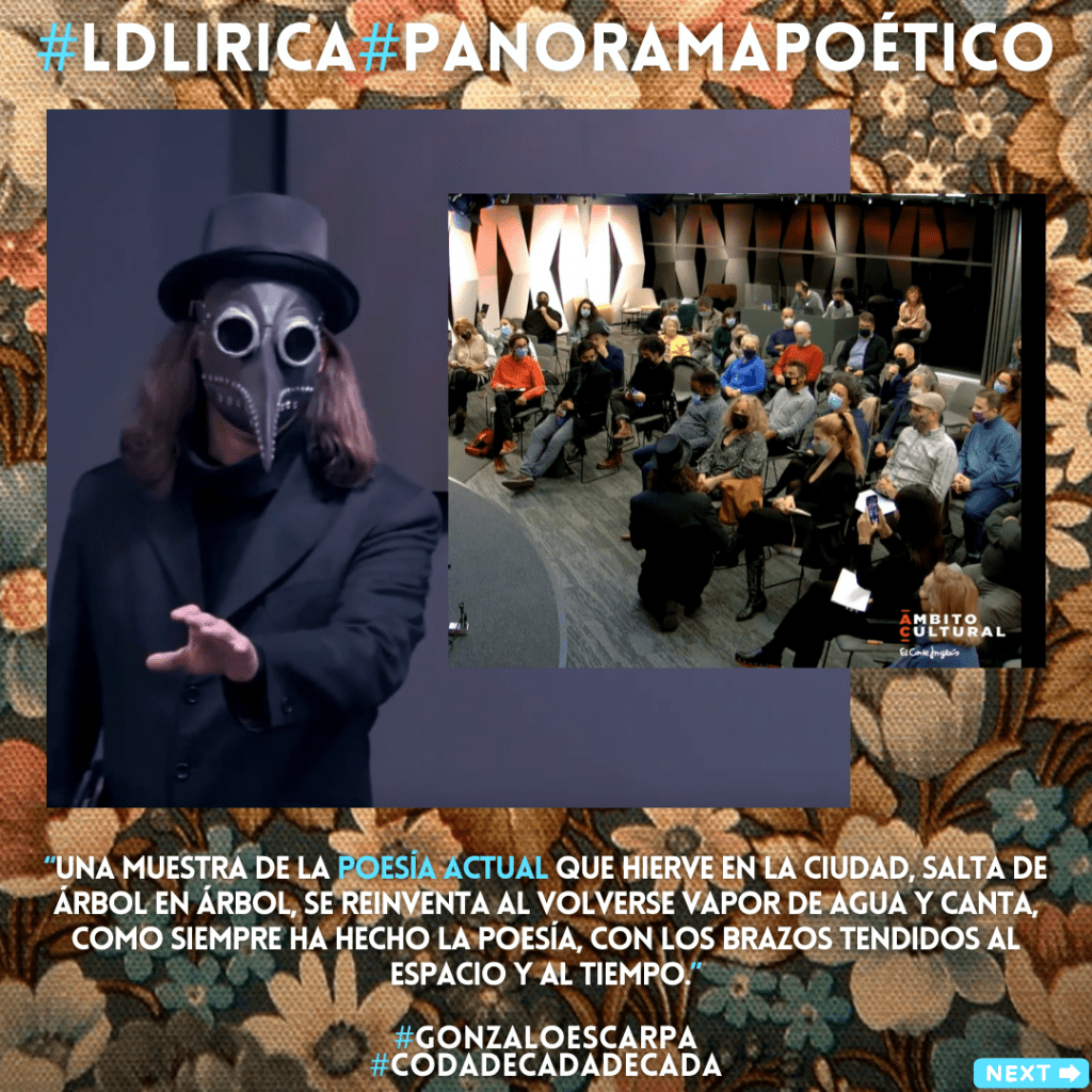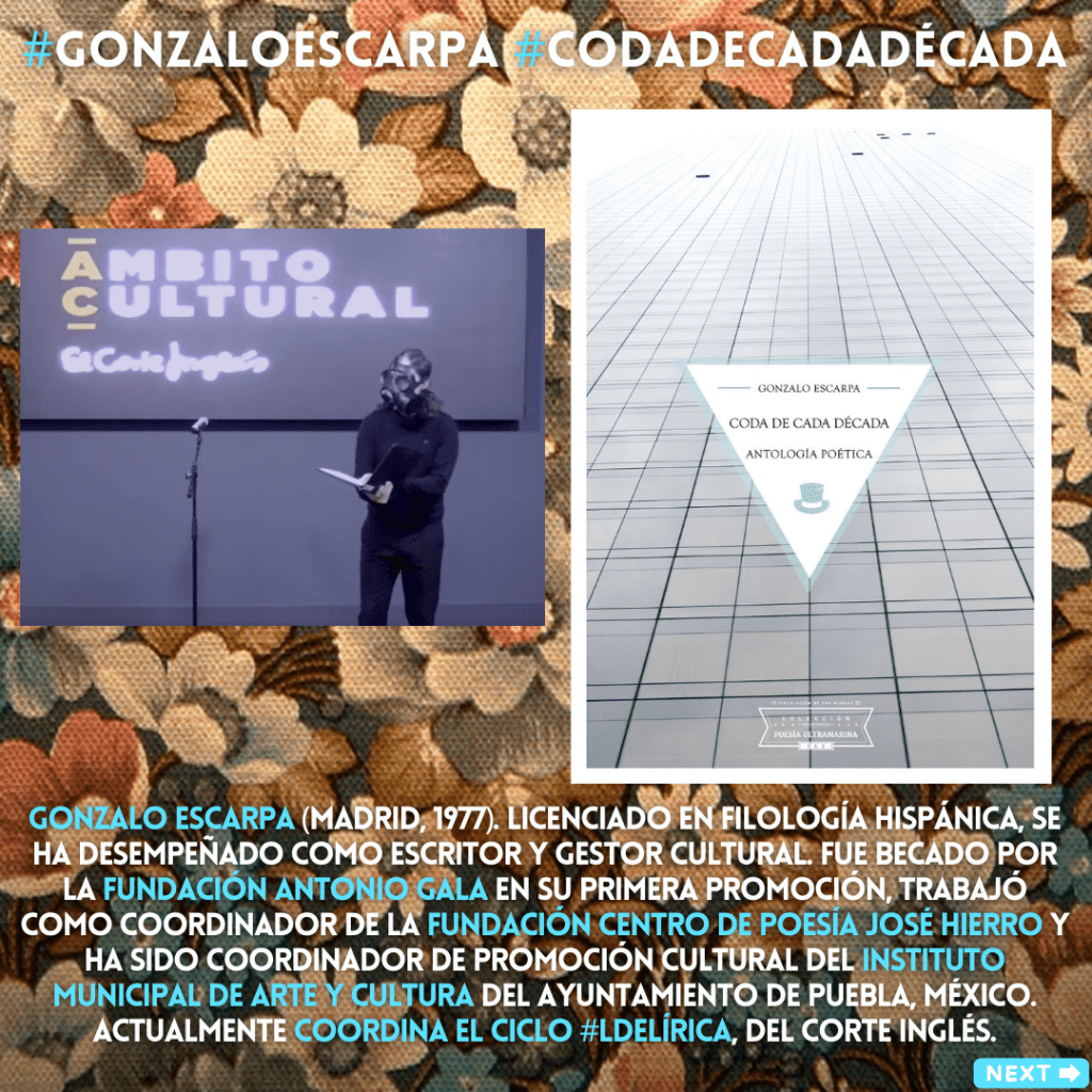 «Minke Wang, Chús Arellano, Julio Hernández, Ignacio Miranda, Pilar Astray Boadicea, Miriam Martins, Curro Rumbao, Marisa Bello, David Foronda, Álvaro Muñoz Robledano y Eudris Planche son los poetas que participarán en el acto conducido por Gonzalo Escarpa, y a quienes se ha topado con ellos en los bares, teatros y calles de la ciudad lírica que es Madrid. » A.C.