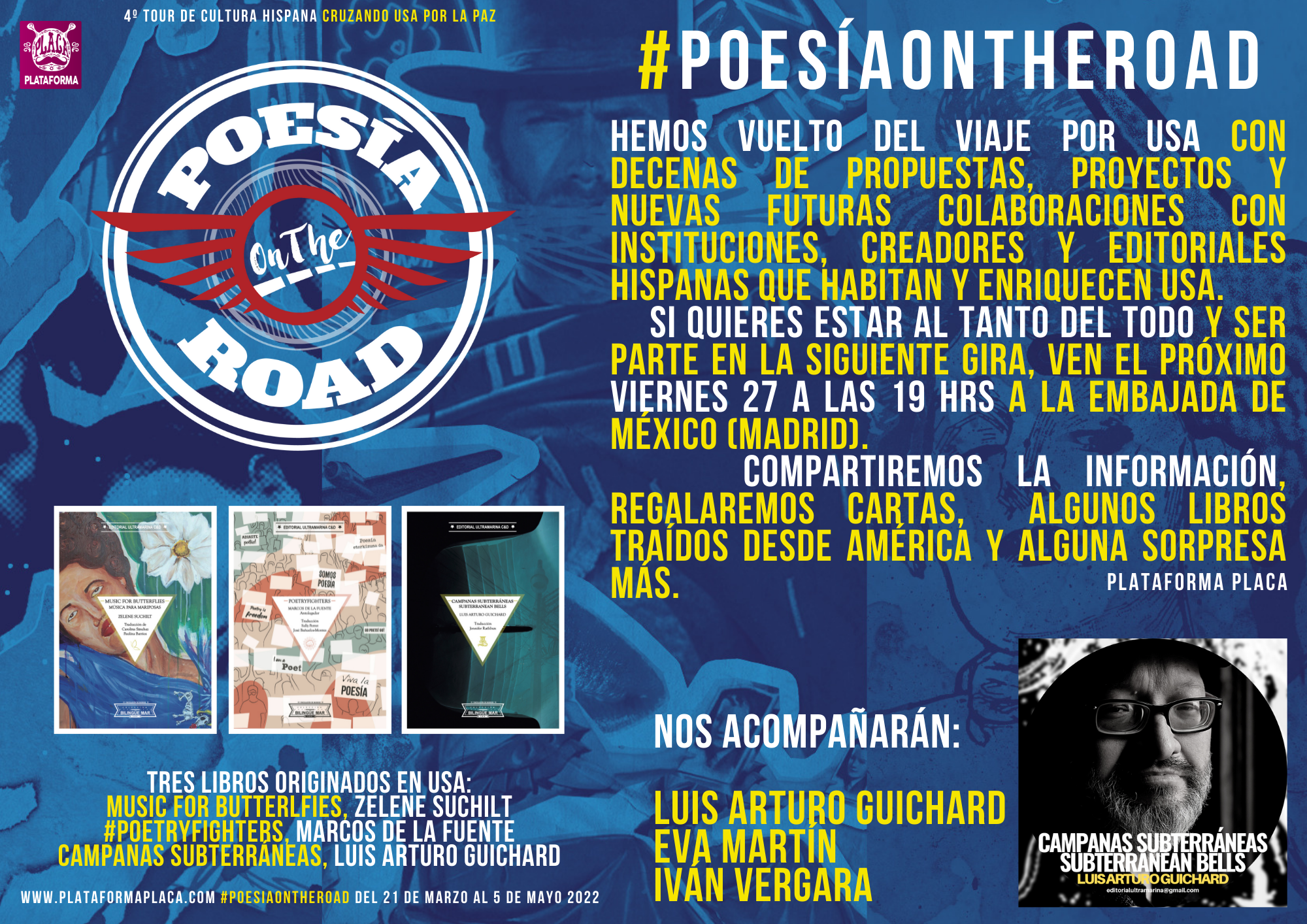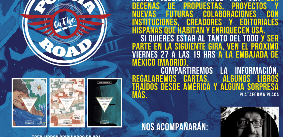 #PoesíaOnTheRoad es un tour que recorrió el norte de USA durante mes y medio y durante el cual se realizaron presentaciones de libros, se impartieron talleres y charlas en diversas universidades, se desarrollaron diversos performances y lo más importante: nos hemos puesto en contacto con empresas culturales, creadores e instituciones de diversos estados de USA para promover el surgimiento de nuevos proyectos, publicaciones y mestizajes entre México, España y USA.