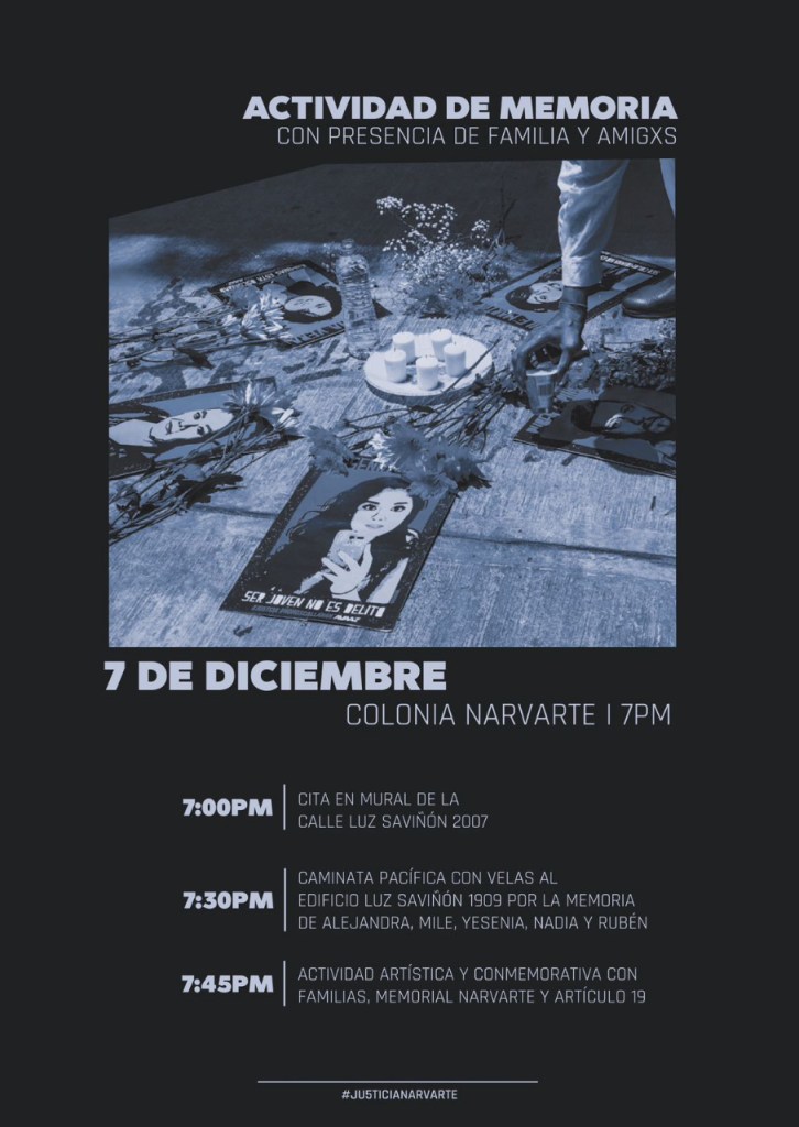 Una investigación de 4 años realizada por @asarnaut y equipo, de la mano de las familias de Alejandra Negrete, Mile Martín, Nadia Vera, Rubén Espinosa y Yesenia Quiroz, así como de sus representantes legales.