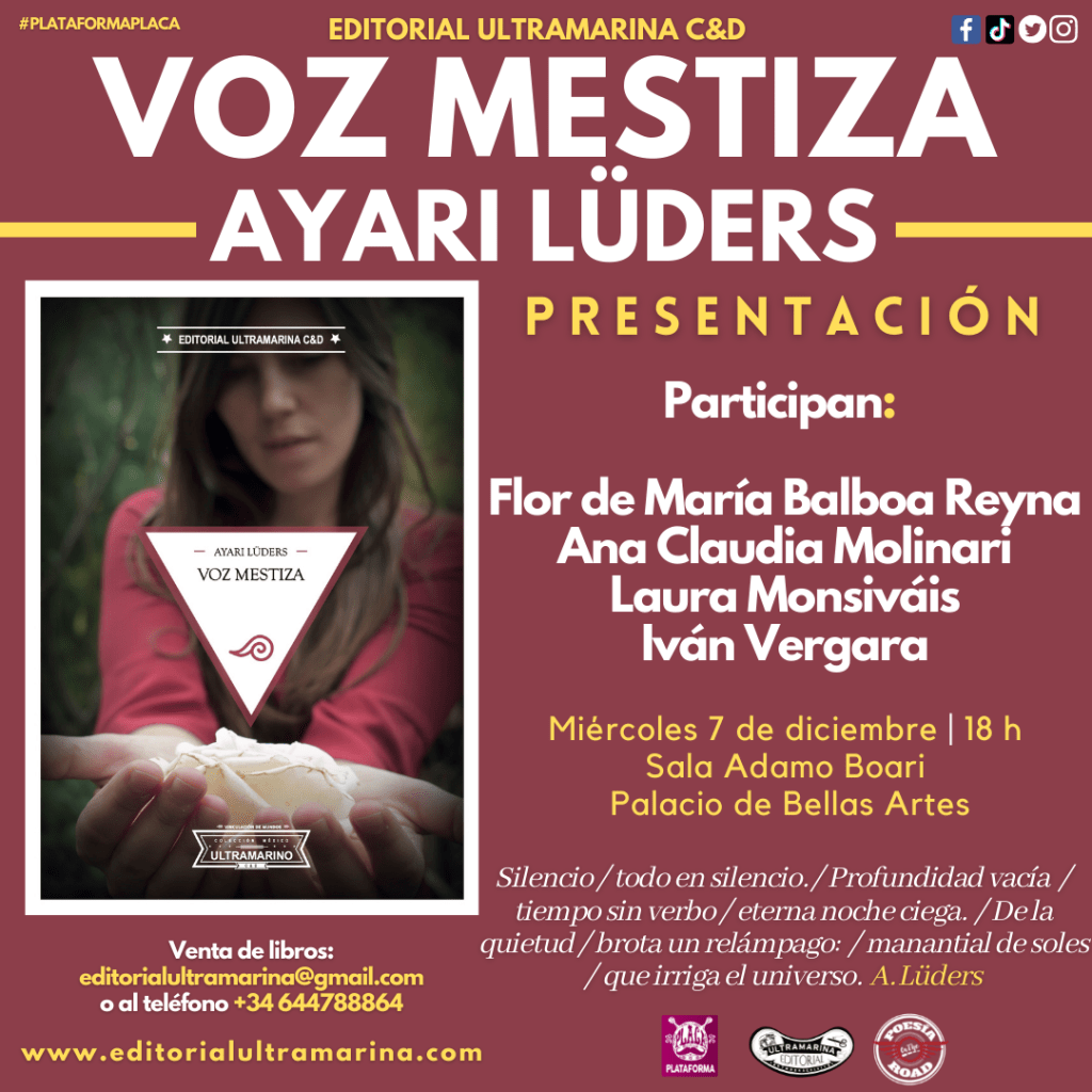 “Voz Mestiza” poema de largo aliento de Ayari Lüders. Miérc 7 dic, 18:00 hrs, Sala Adomi Boari del Palacio de Bellas Artes, CDMX