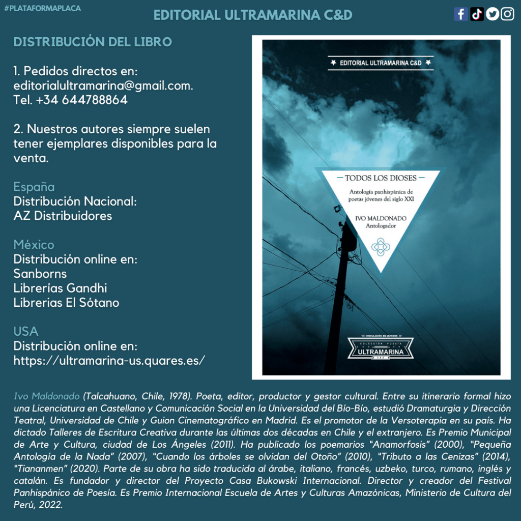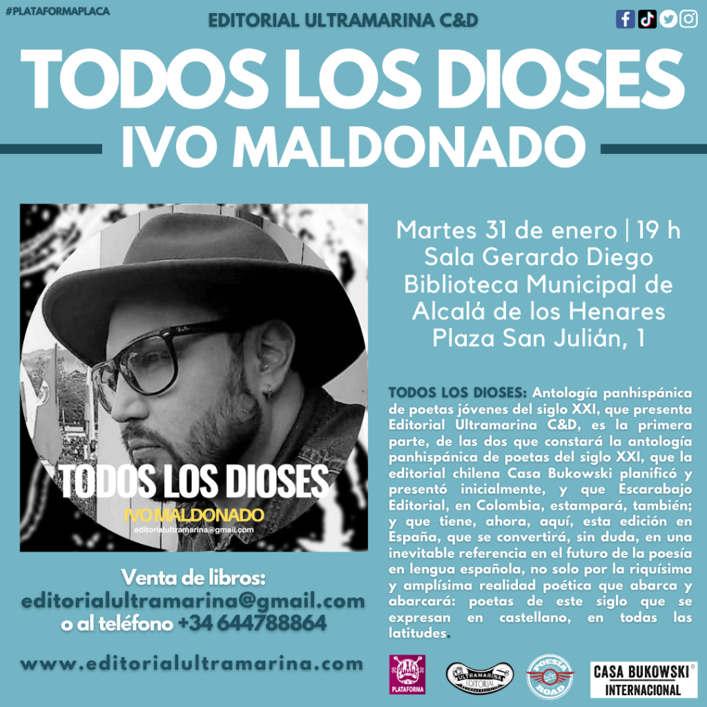 Hola, os anunciamos la PRESENTACIÓN del día martes 31 de enero a las 19 horas en la Sala Gerardo Diego, Biblioteca Municipal de Alcalá de Henares. Plaza San Julián, 1, de la ANTOLOGÍA: Todos los dioses: antología panhispánica de poesía joven del siglo XXI. Editorial Ultramarina C&D y Casa Bukowski. 2022