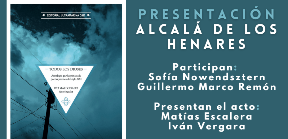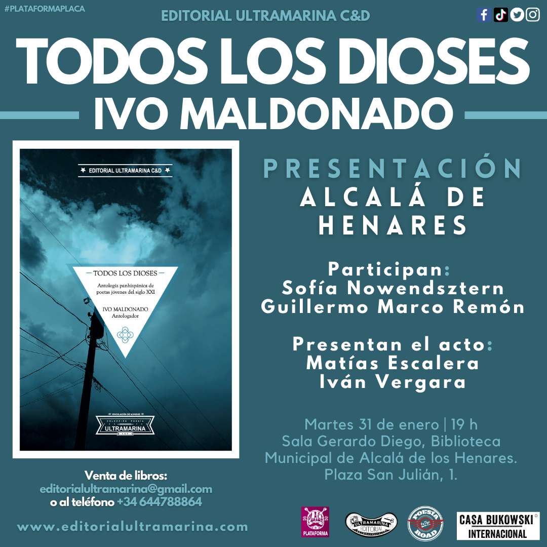 Hola, os anunciamos la PRESENTACIÓN del día martes 31 de enero a las 19 horas en la Sala Gerardo Diego, Biblioteca Municipal de Alcalá de Henares. Plaza San Julián, 1, de la ANTOLOGÍA: Todos los dioses: antología panhispánica de poesía joven del siglo XXI. Editorial Ultramarina C&D y Casa Bukowski. 2022