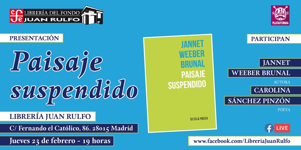 El Librería Del Fondo y Plataforma PLACA hospedaran Jannet Weeber Brunal y su libro: Paisaje Suspendido y también Carolina Sánchez Pinzón. La poeta y autora recitarán en Librería Juan Rulfo en Madrid, España el Jueves 23 de febrero a las 19 horas.
