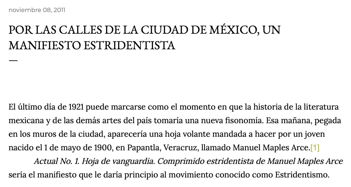 El último día de 1921 puede marcarse como el momento en que la historia de la literatura mexicana y de las demás artes del país tomaría una nueva fisonomía. Esa mañana, pegada en los muros de la ciudad, aparecería una hoja volante mandada a hacer por un joven nacido el 1 de mayo de 1900, en Papantla, Veracruz, llamado Manuel Maples Arce.