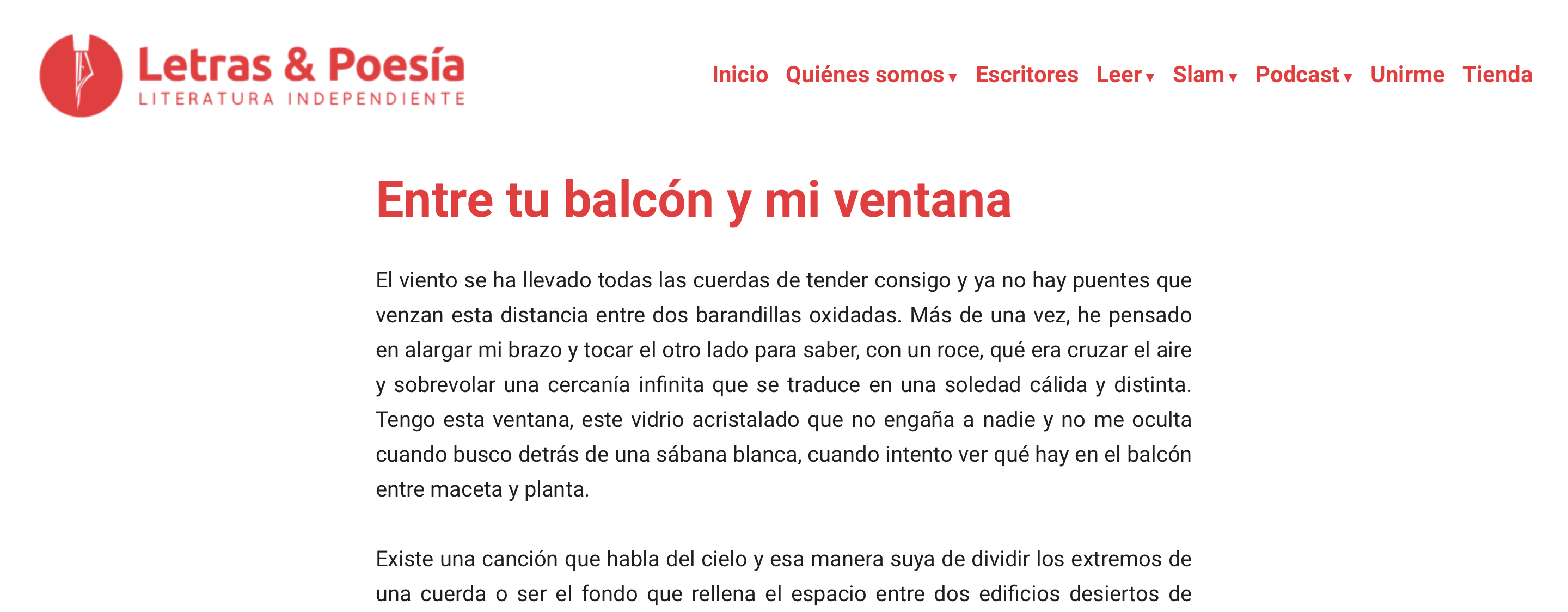 «El viento se ha llevado todas las cuerdas de tender consigo y ya no hay puentes que venzan esta distancia entre dos barandillas oxidadas. Más de una vez, he pensado en alargar mi brazo y tocar el otro lado para saber, con un roce, qué era cruzar el aire y sobrevolar una cercanía infinita que se traduce en una soledad cálida y distinta. Tengo esta ventana, este vidrio acristalado que no engaña a nadie y no me oculta cuando busco detrás de una sábana blanca, cuando intento ver qué hay en el balcón entre maceta y planta.»
