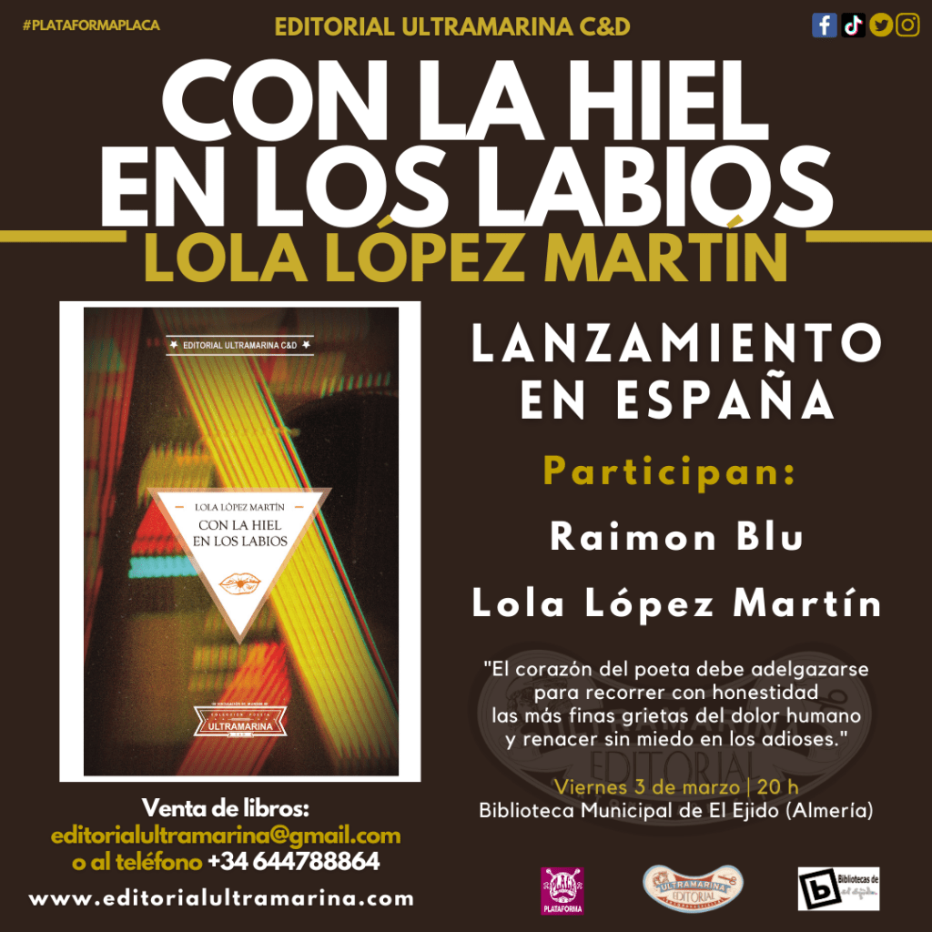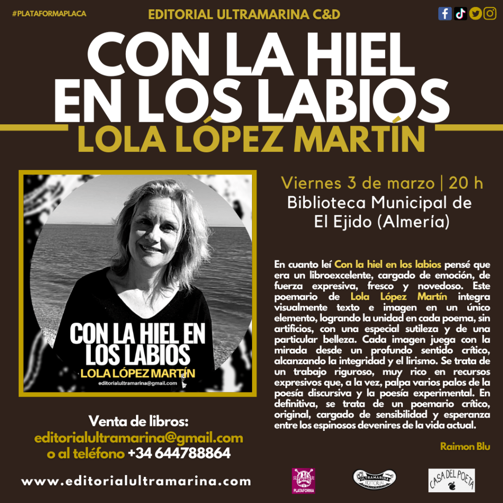 En cuanto leí Con la hiel en los labios pensé que era un libroexcelente, cargado de emoción, de fuerza expresiva, fresco y novedoso. Este poemario de Lola López Martín integra visualmente texto e imagen en un único elemento, logrando la unidad en cada poema, sin artificios, con una especial sutileza y de una particular belleza. Cada imagen juega con la mirada desde un profundo sentido crítico, alcanzando la integridad y el lirismo. Se trata de un trabajo riguroso, muy rico en recursos expresivos que, a la vez, palpa varios palos de la poesía discursiva y la poesía experimental. En definitiva, se trata de un poemario crítico, original, cargado de sensibilidad y esperanza entre los espinosos devenires de la vida actual.