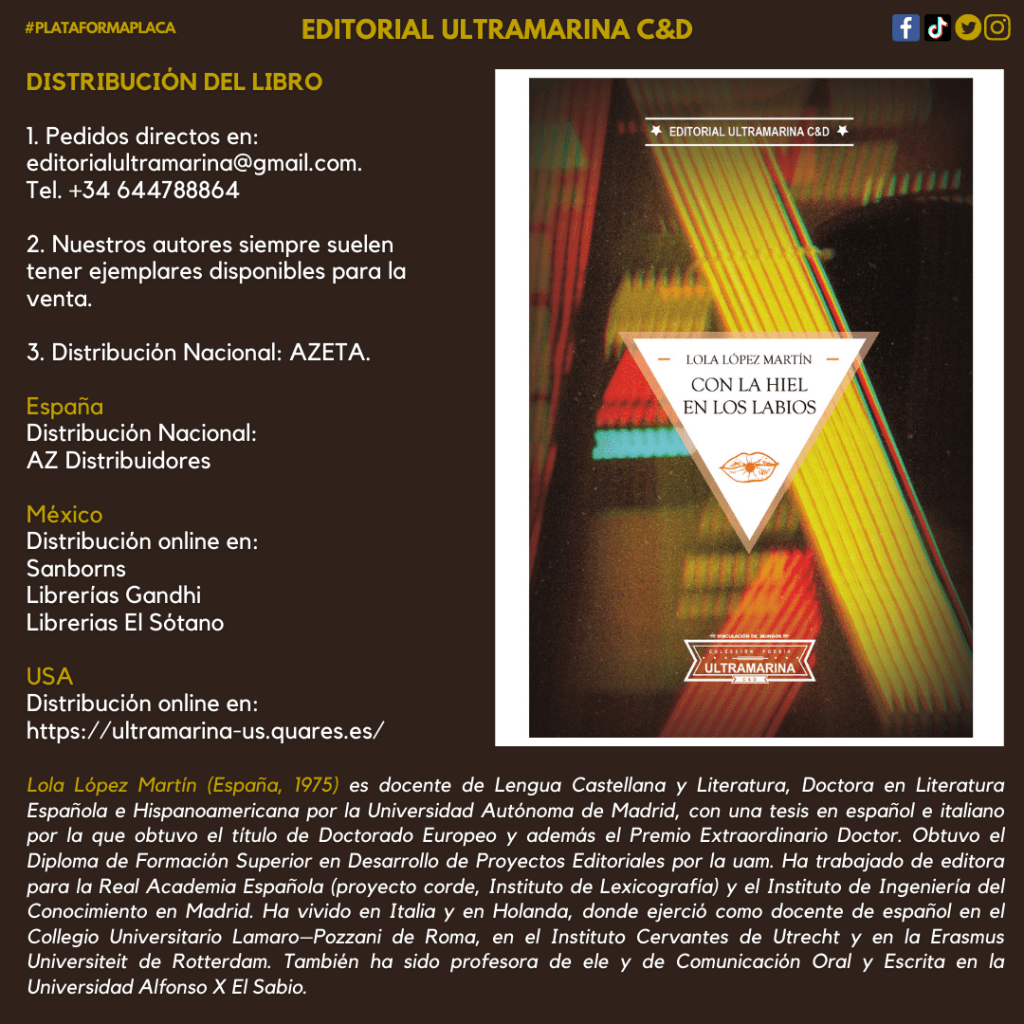 «Lola López Martín (España, diciembre de 1975) es docente de Lengua Castellana y Literatura, Doctora en Literatura Española e Hispanoamericana por la Universidad Autónoma de Madrid, con una tesis en español e italiano por la que obtuvo el título de Doctorado Europeo y además el Premio Extraordinario Doctor.