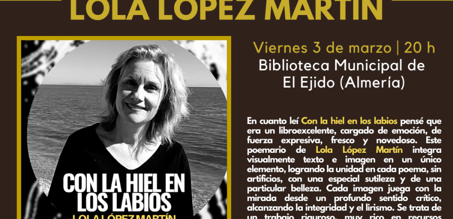 En cuanto leí Con la hiel en los labios pensé que era un libroexcelente, cargado de emoción, de fuerza expresiva, fresco y novedoso. Este poemario de Lola López Martín integra visualmente texto e imagen en un único elemento, logrando la unidad en cada poema, sin artificios, con una especial sutileza y de una particular belleza. Cada imagen juega con la mirada desde un profundo sentido crítico, alcanzando la integridad y el lirismo. Se trata de un trabajo riguroso, muy rico en recursos expresivos que, a la vez, palpa varios palos de la poesía discursiva y la poesía experimental. En definitiva, se trata de un poemario crítico, original, cargado de sensibilidad y esperanza entre los espinosos devenires de la vida actual.
