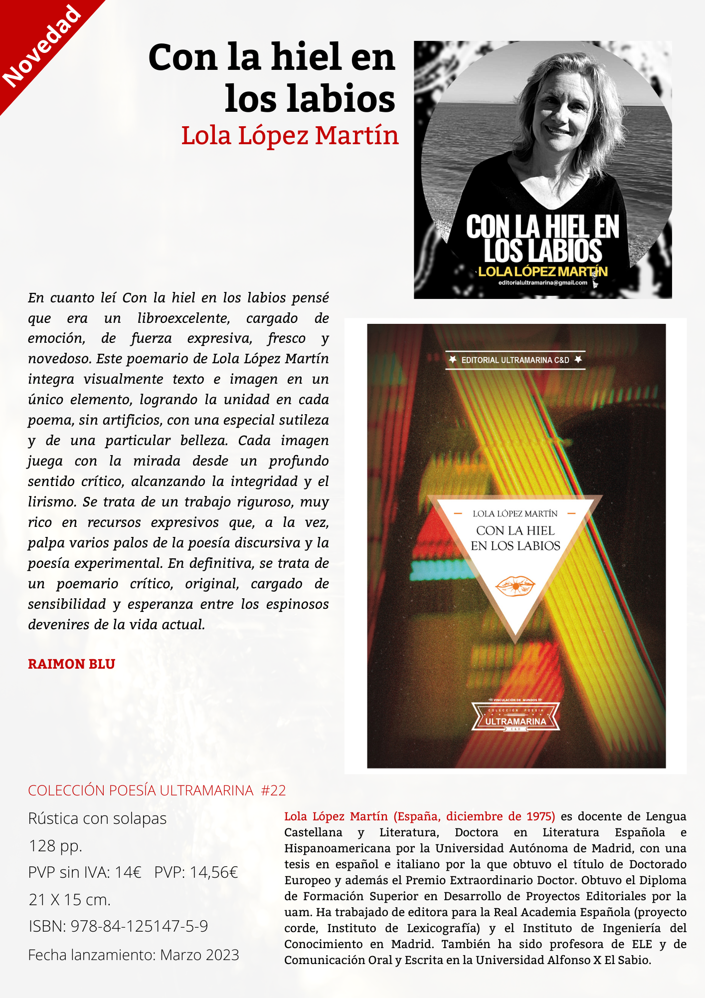 «Lola López Martín (España, diciembre de 1975) es docente de Lengua Castellana y Literatura, Doctora en Literatura Española e Hispanoamericana por la Universidad Autónoma de Madrid, con una tesis en español e italiano por la que obtuvo el título de Doctorado Europeo y además el Premio Extraordinario Doctor.