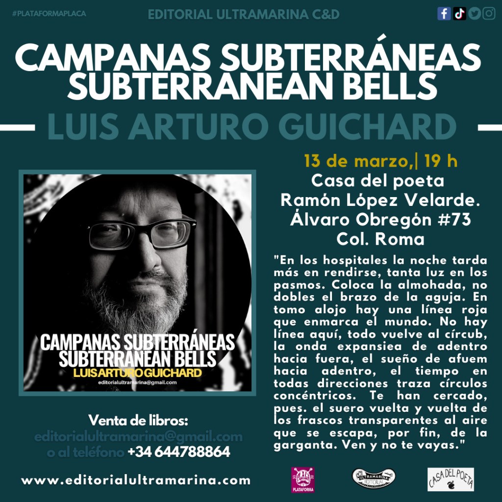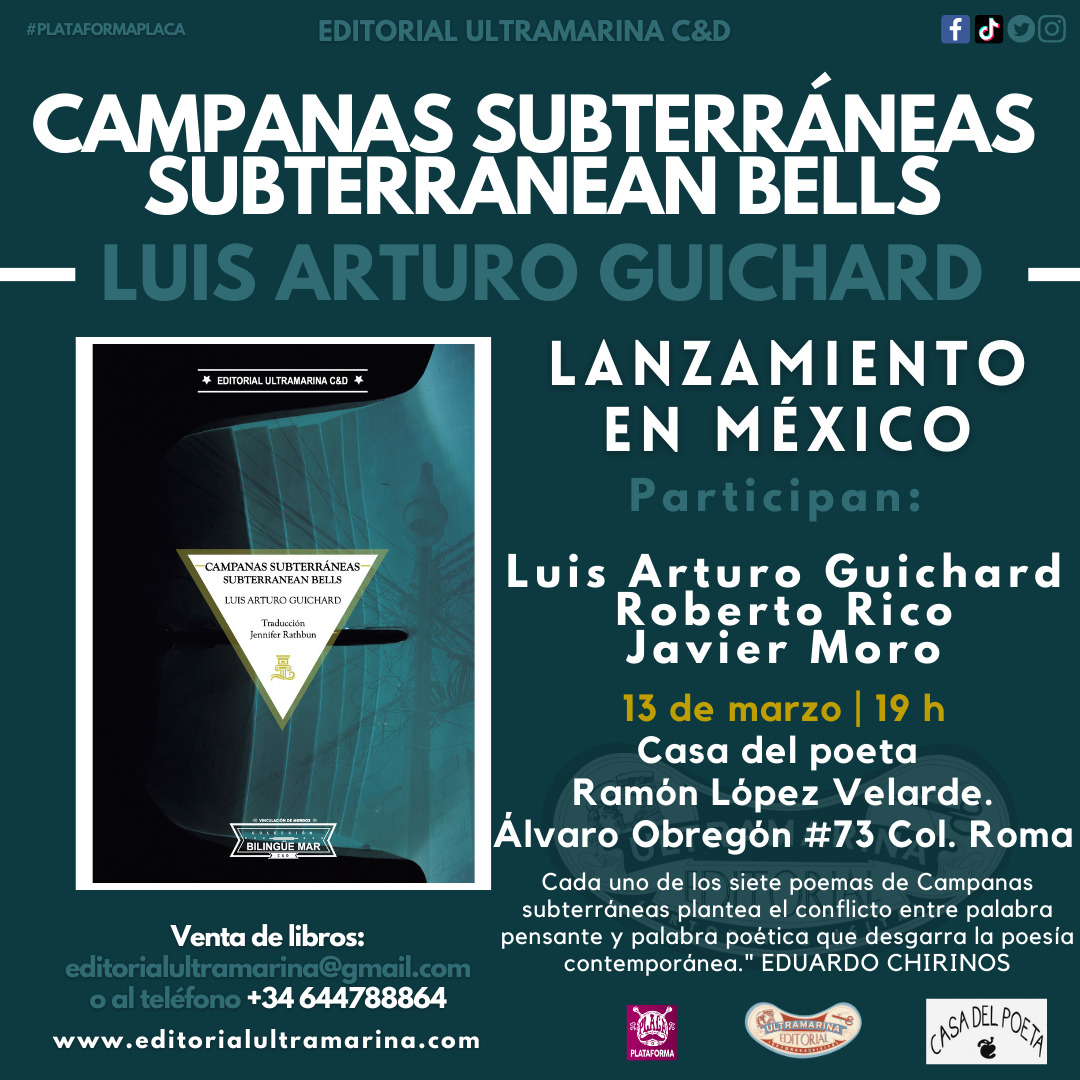 «El lunes 13 de marzo presentamos la edición bilingüe de Campanas subterráneas / Subterranean bells, traducido por Jennifer Rathbun, que ya rolamos por España y Estados Unidos. Me acompañarán en la Casa del poeta Roberto Rico y Javier Javier Moro Hernandez . A las siete. El que pueda, que caiga.»
