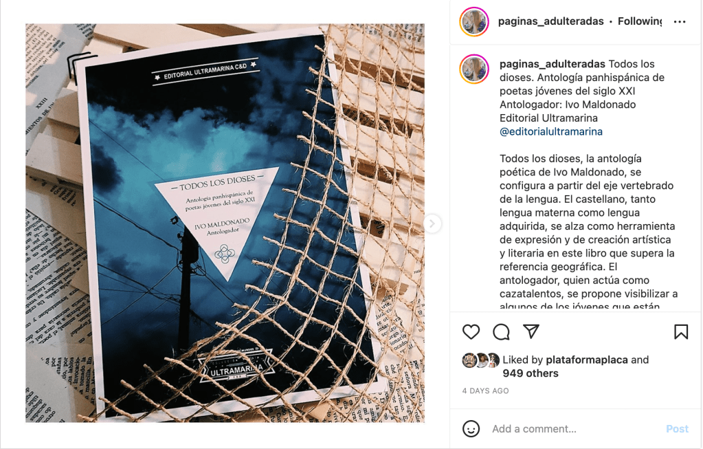 «Todos los dioses, la antología poética de Ivo Maldonado, se configura a partir del eje vertebrado de la lengua. El castellano, tanto lengua materna como lengua adquirida, se alza como herramienta de expresión y de creación artística y literaria en este libro que supera la referencia geográfica. El antologador, quien actúa como cazatalentos, se propone visibilizar a algunos de los jóvenes que están llamados a convertirse en los grandes representantes de la poesía de nuestras tierras. Así, en sus poco más de trescientas páginas, podemos encontrar composiciones de poetas de Argentina, Bolivia, Chile, Colombia, Costa Rica, Ecuador, España, Guatemala, Italia, México, Nicaragua, Panamá, Perú y Uruguay. Y este solo es el primero de una colección de dos volúmenes repletos de tesoros líricos.» – @paginas_adulteradas