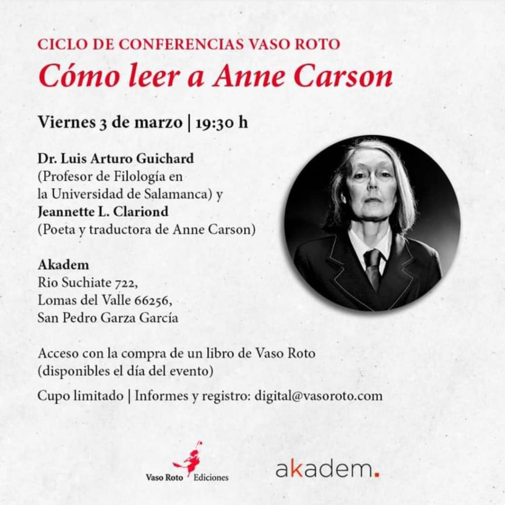 Hay una conferencia de Dr. Luis Arturo Guichard un profesor de Filología en el Viernes 3 de Marzo a las 19:30 horas, sobre Anne Carson. Puedes acceso con la compra de un libro de Vaso Roto cual es disponibles el día del evento.
