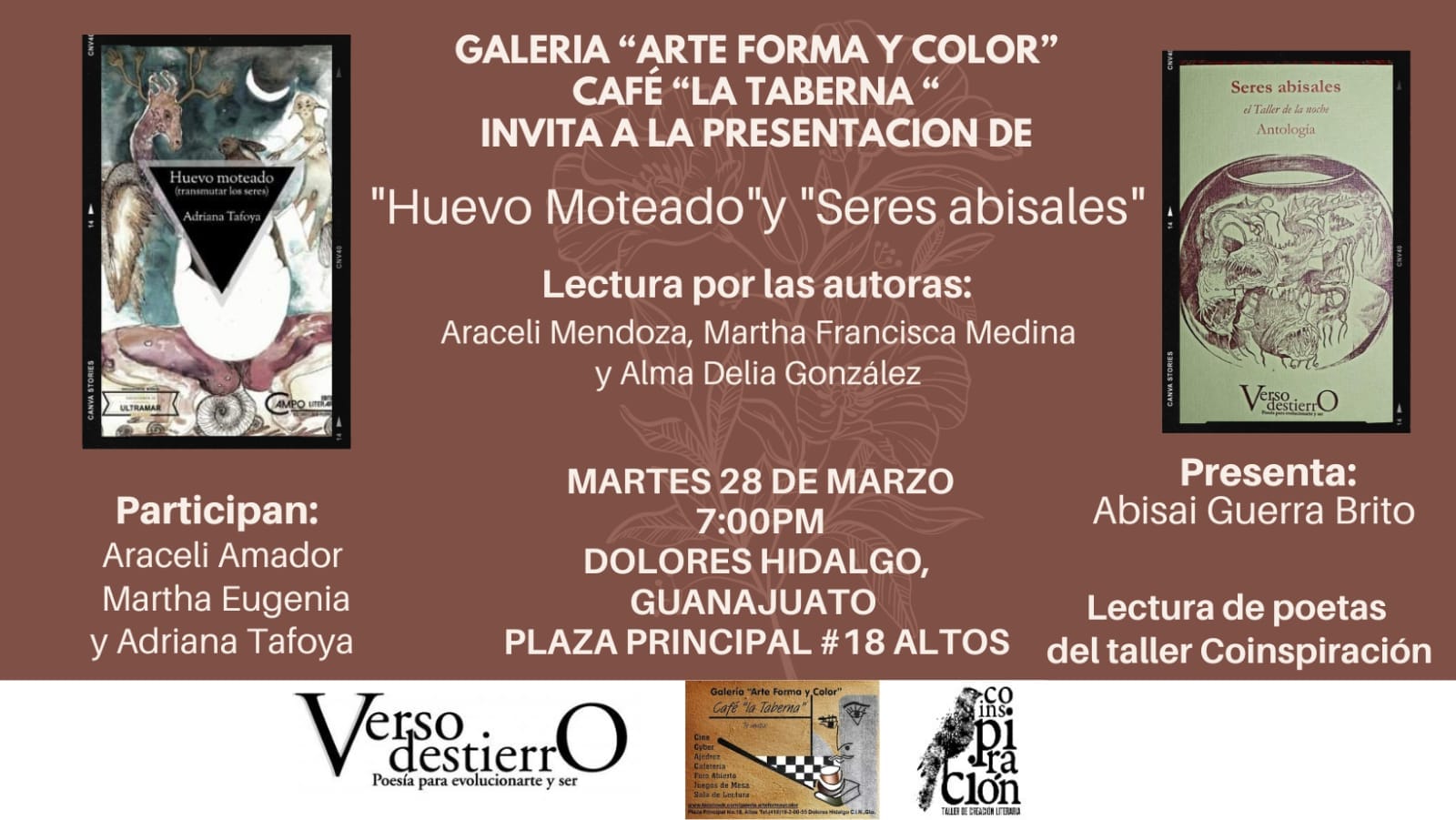 Galería «Arte forma y color» café «la taberna» invita a la presentación de ‘Huevo Moteado’ y ‘Seres abisales’ para una lectura de poetas del taller Coinspiración.