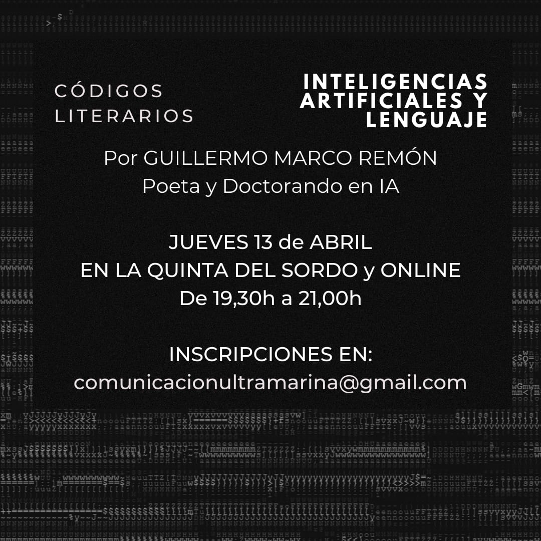 «Inteligencias Artificiales y Lenguaje» es una charla sobre literatura electrónica presentada por el poeta e investigador Guillermo Marco Remón. En la ponencia, se hablarán de los últimos avances de las IA en nuestro mundo y cómo han ido instalándose en parcelas de nuestra realidad como el lenguaje, desde una visión histórica con Alan Turing a la cabeza hasta una reflexión literaria y filosófica sobre lo que estos avances implican