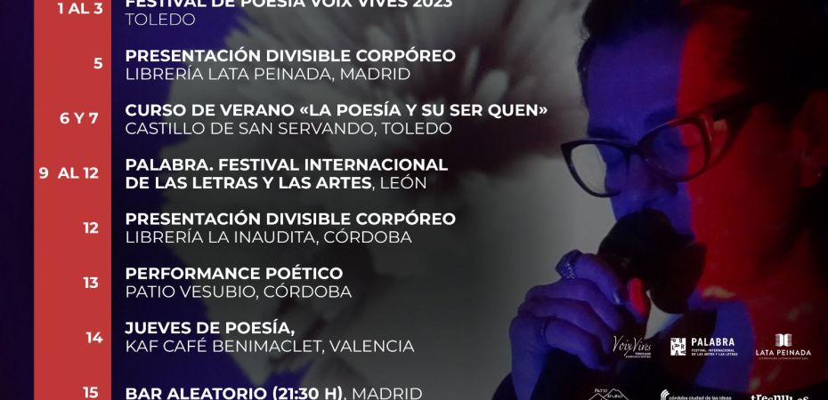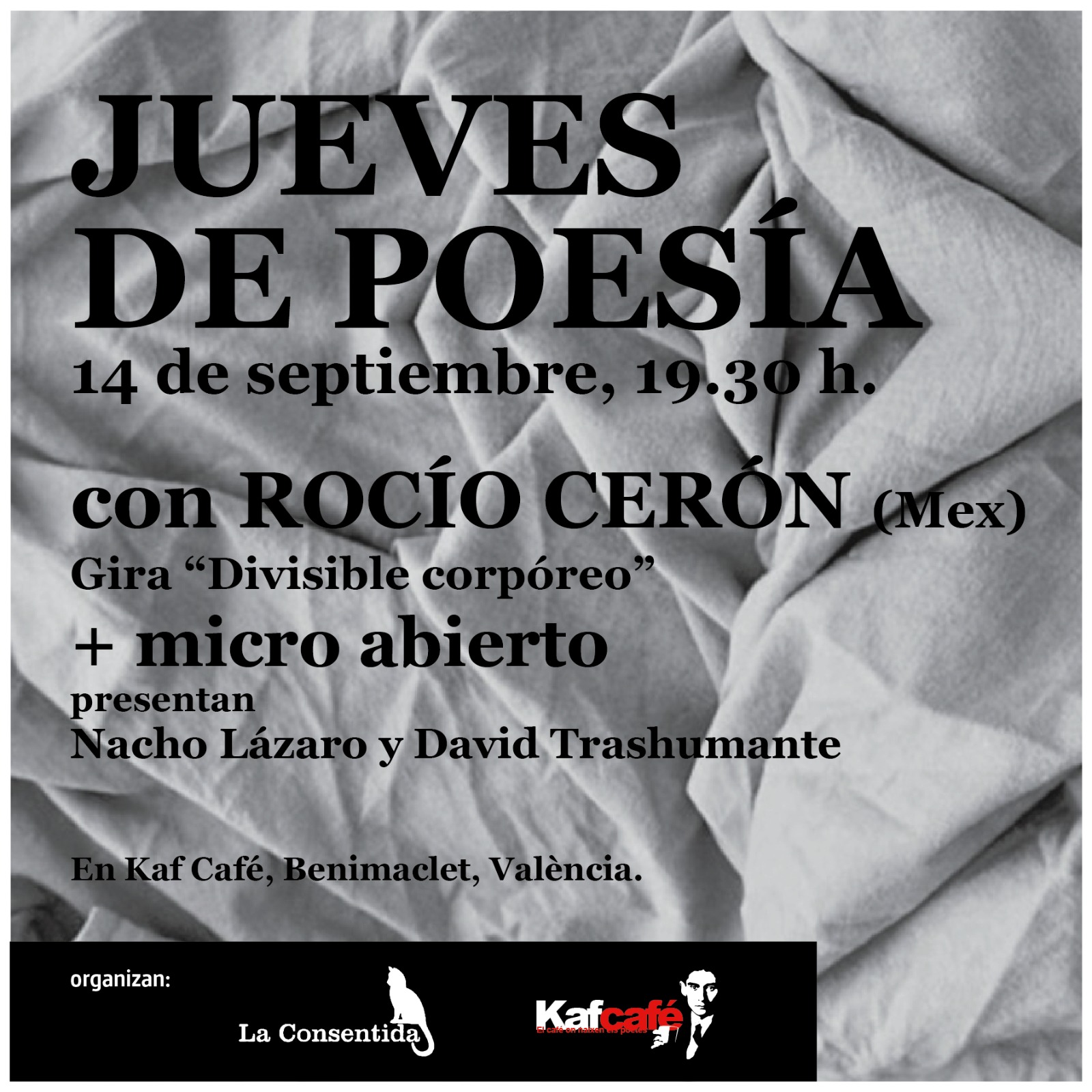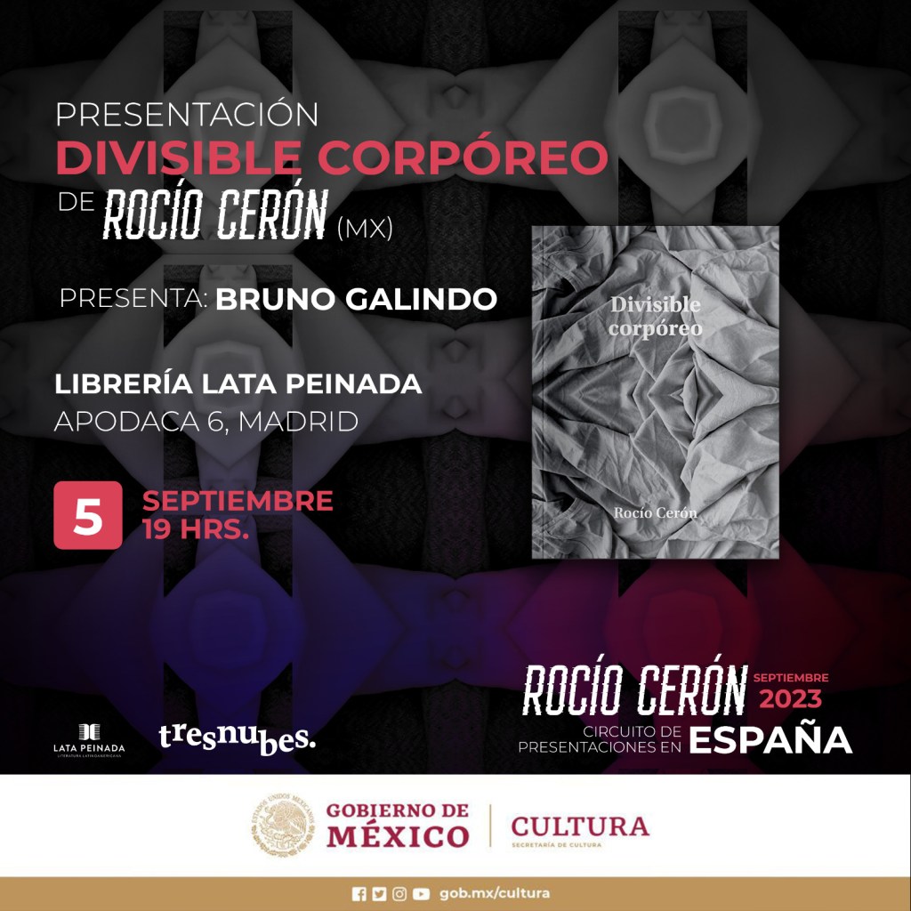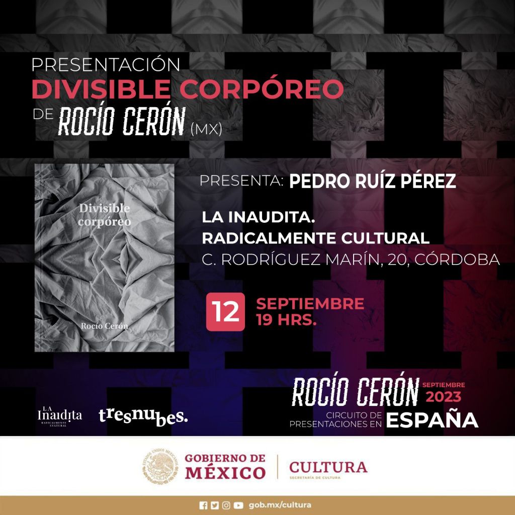La poeta y creadora mexicana Rocío Cerón realizará performances poéticos/sonoros, talleres, conferencias y presentará su libro #DivisibleCorpóreo en un circuito por España durante septiembre de 2023. Las actividades son apoyadas por la Secretaría de Cultura de México. Toledo, Madrid, Córdoba, Valencia y Huelva recibirán a esta creadora de quien Agustín González Malló ha dicho: «Cerón dota de carne viva al lenguaje. Su compromiso poético con la abstracción y con la experiencia inmediata es radical, absoluto. Rocío Cerón, siempre un paso más allá del horizonte, es un caso único en nuestras letras.»