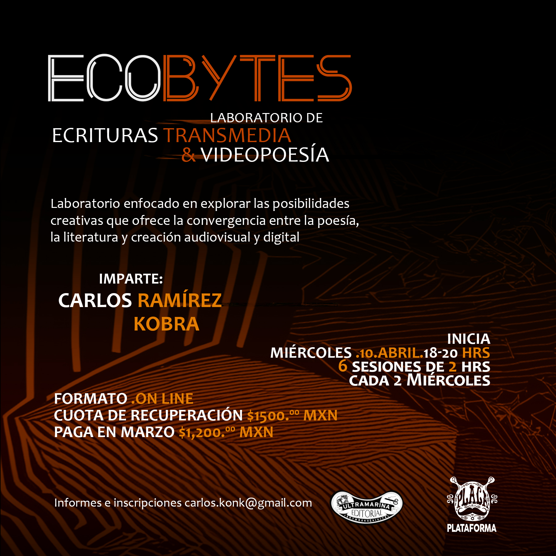 El coordinador de la Plataforma PLACA en México impartirá a partir del 10 de abril el laboratorio EcoBytes, en torno a las escrituras transmediales, un espacio enfocado en explorar las posibilidades creativas que ofrece la convergencia entre la poesía, la literatura y creación audiovisual y digital.