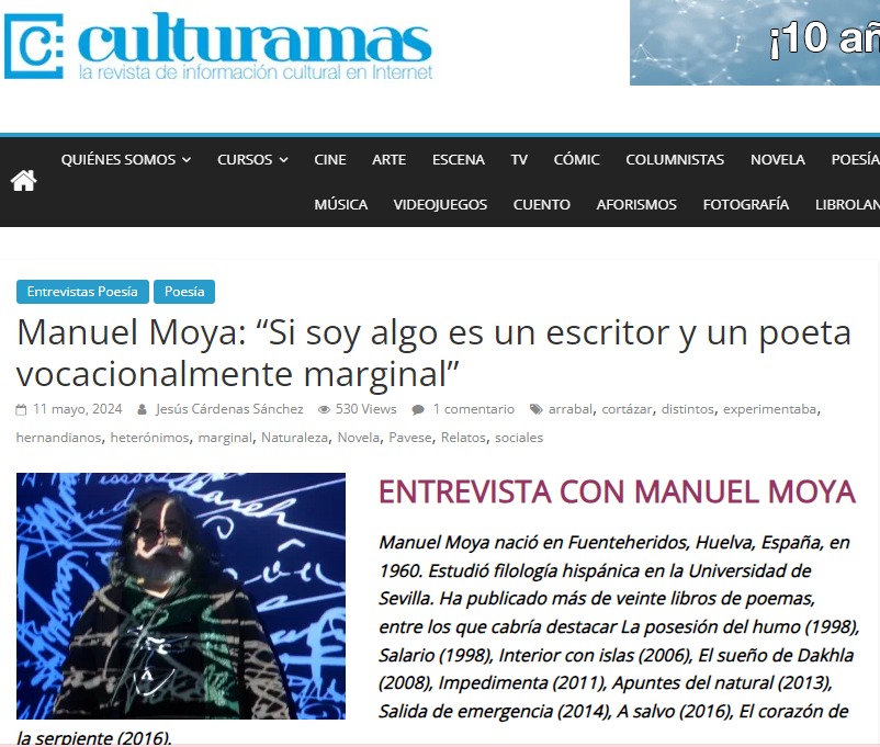 Lee la entrevista completa y adéntrate en el universo literario de Manuel Moya en Culturama https://www.culturamas.es/2024/05/11/manuel-moya-si-soy-algo-es-un-escritor-y-un-poeta-vocacionalmente-marginal. Esta es una oportunidad única para explorar las reflexiones y las motivaciones de un poeta que desafía las convenciones establecidas.