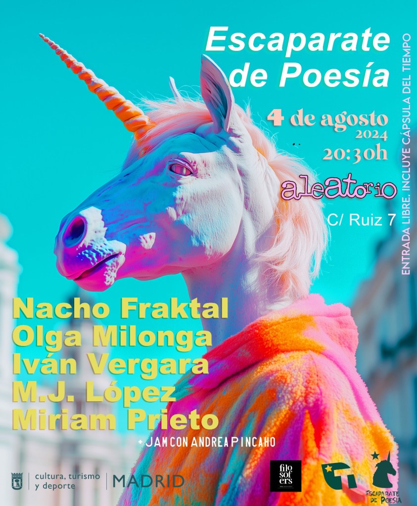 Nos emociona anunciar la participación de Iván Vergara y Miriam Prieto (Nuevas miradas) en el evento Escaparate de Poesía, que se llevará a cabo el próximo 4 de agosto a las 20:30 h en Aleatorio (C/ Ruiz 7), Madrid. Esta velada poética contará también con las actuaciones de Nacho Fraktal, Olga Milonga y M.J. López, culminando con una jam session a cargo de Andrea Pincaho.