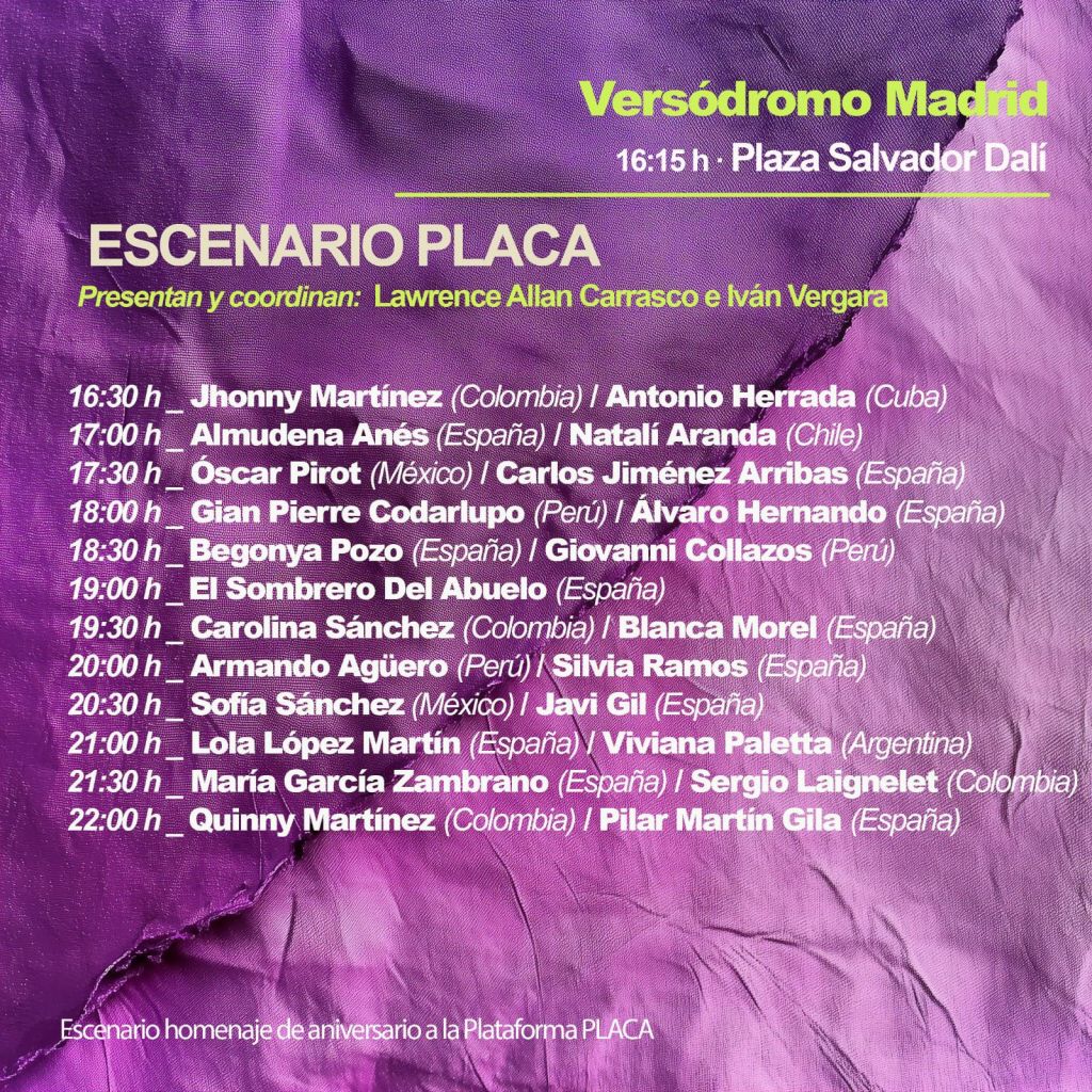 Este 14 de septiembre de 2024, la Plataforma PLACA (Poesía y Artes. Puente Cultural Americano-Hispano), conmemorará sus 18 años de existencia en el emblemático Versódromo de Madrid. La celebración será en la Plaza Salvador Dalí, y contará con una amplia representación de poetas de diversas partes de Iberoamérica.