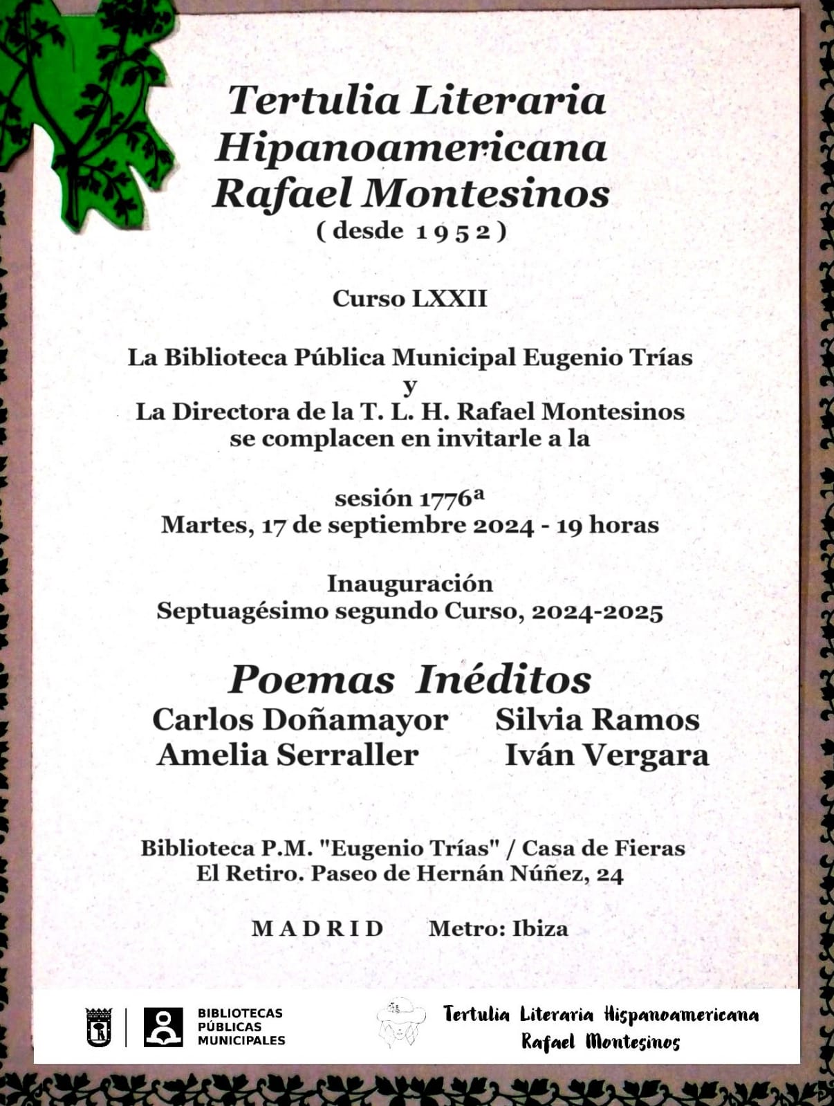 El próximo martes, 17 de septiembre de 2024, la Biblioteca Pública Municipal Eugenio Trías acogerá la inauguración del septuagésimo segundo curso de la emblemática Tertulia Literaria Hispanoamericana Rafael Montesinos, que data desde 1952. En esta sesión inaugural, marcada por la lectura de poemas inéditos, destacará la participación de Iván Vergara, junto a reconocidos poetas como Carlos Doñamayor, Silvia Ramos y Amelia Serraller.