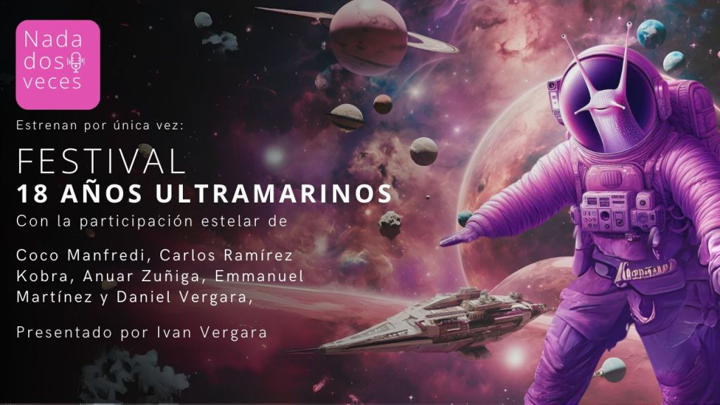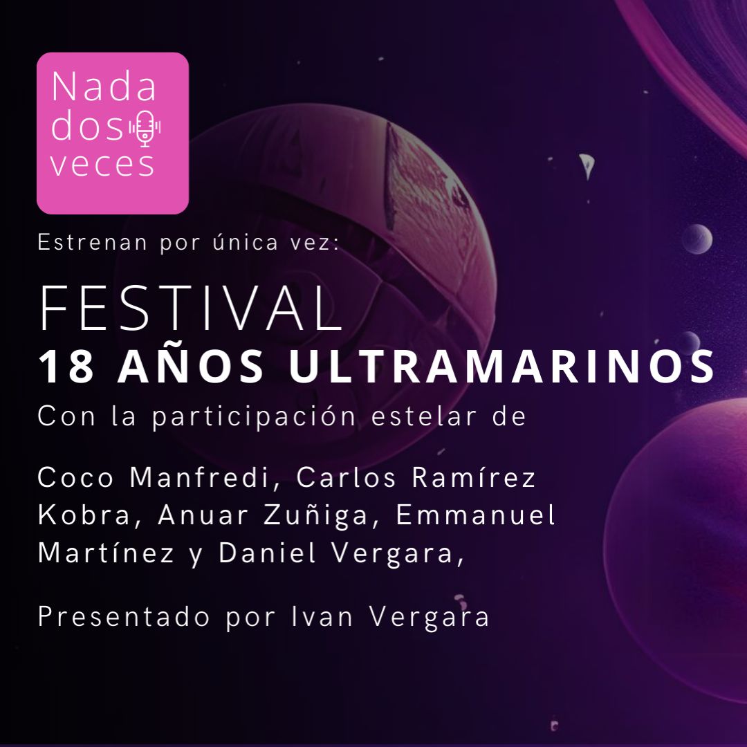 ¡El Festival 18 Años Ultramarinos está listo para ser emitido el jueves 26 de septiembre en un episodio especial del programa Nada dos veces! La emisión conmemorará los 18 años de trayectoria de Ultramarina Cartonera & Digital, un proyecto literario clave en la poesía y literatura independiente. Presentado por Iván Vergara, el festival contará con la participación especial de Coco Manfredi, Carlos Ramírez Kobra, Anuar Zúñiga, Emmanuel Martínez, y Daniel Vergara. Este evento transmedia promete ser un despliegue artístico único que marcará un hito en la historia de la editorial.