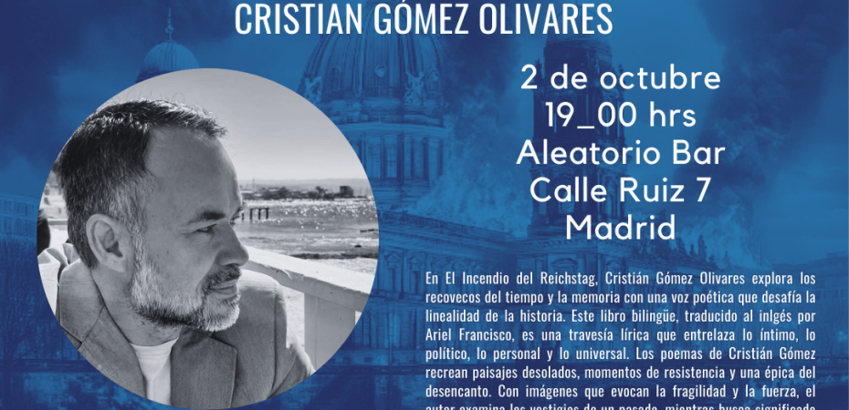 Nos complace anunciar la presentación del más reciente título de la colección Bilingüe Mar de la Editorial Ultramarina C&D: El incendio del Reichstag / Burning of the Reichstag de Cristian Gómez Olivares. Este evento tendrá lugar el próximo 2 de octubre de 2024 a las 19:00 horas en Aleatorio Bar, Calle Ruiz 7, Madrid.