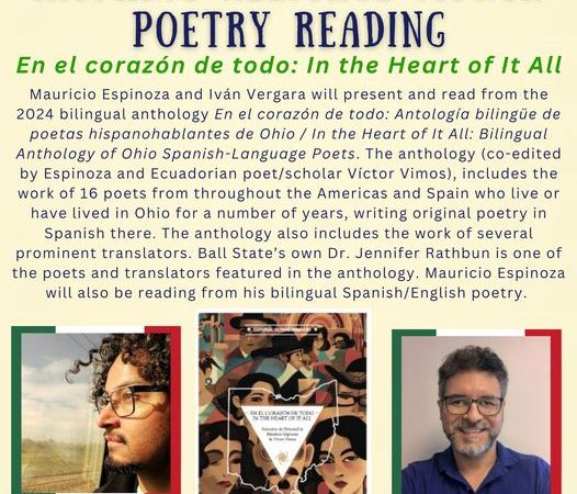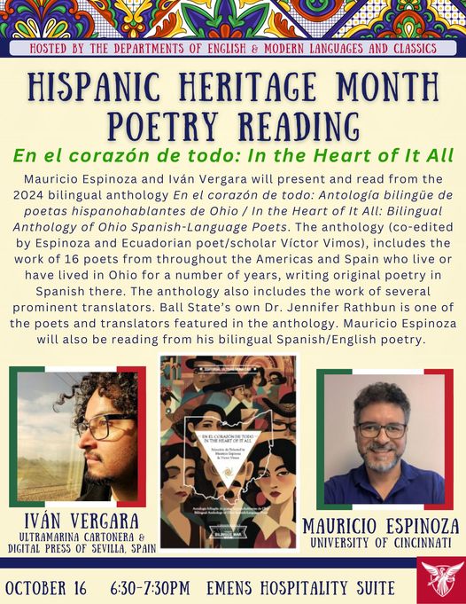 El próximo 16 de octubre, dentro del Hispanic Heritage Month Poetry Reading en la Ball State University, se presentará la antología bilingüe En el corazón de todo: Antología bilingüe de poetas hispanohablantes de Ohio / In the Heart of It All: Bilingual Anthology of Ohio Spanish-Language Poets, coeditada por Mauricio Espinoza e Iván Vergara. Esta antología reúne a 16 poetas que han vivido en Ohio y escrito poesía original en español. La obra destaca por incluir traducciones de importantes poetas y traductores como Jennifer Rathbun, quien también participará en el evento.