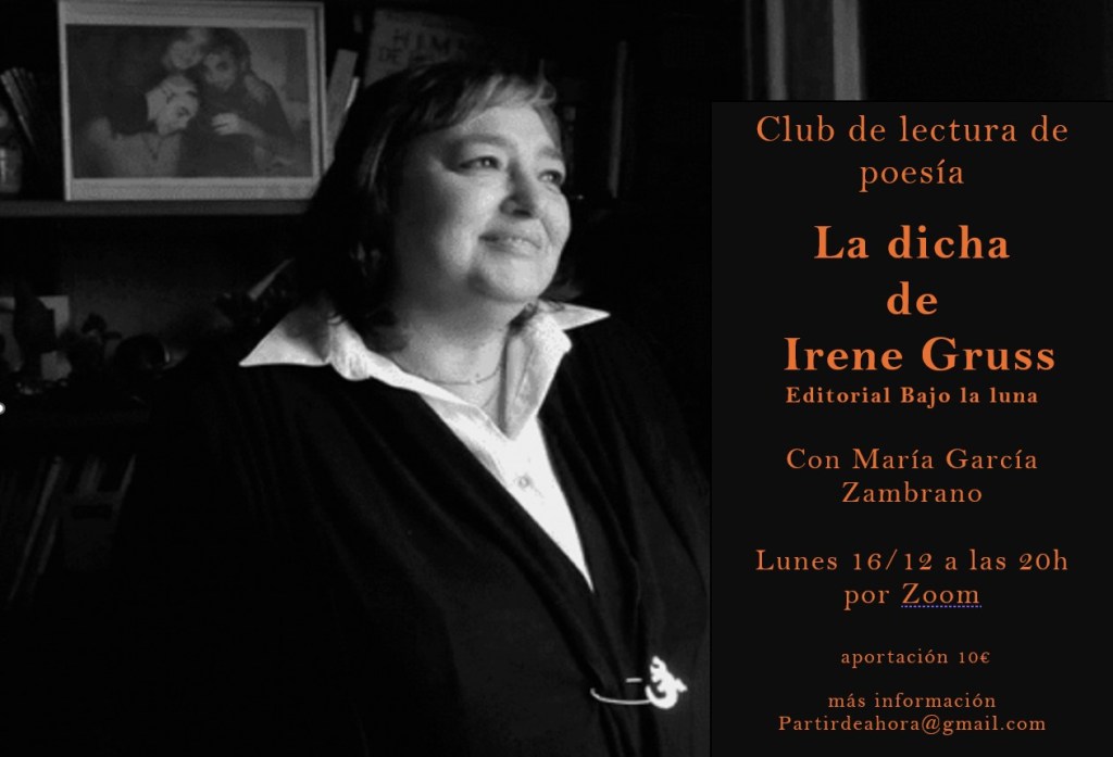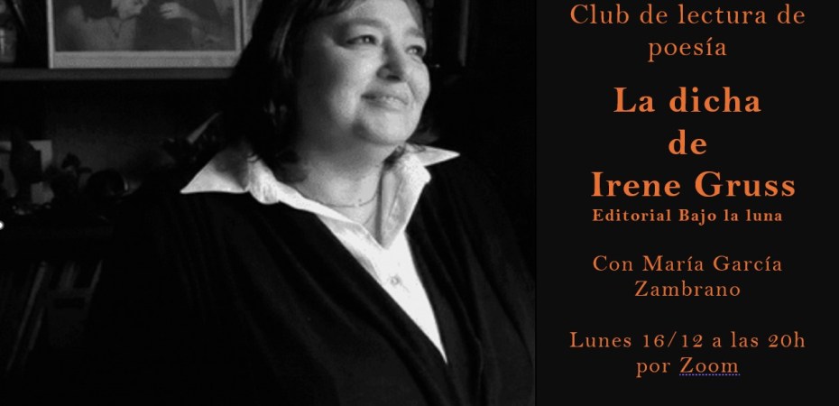 📚 El próximo Club de Lectura de Poesía será un homenaje a la obra La dicha de la emblemática poeta argentina Irene Gruss, publicada por Editorial Bajo la Luna. La sesión será dirigida por la talentosa poeta española María García Zambrano, quien nos llevará de la mano por las profundidades de una obra que mezcla sensibilidad, cotidianeidad y una perspectiva única sobre la poesía contemporánea.