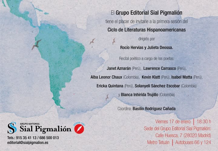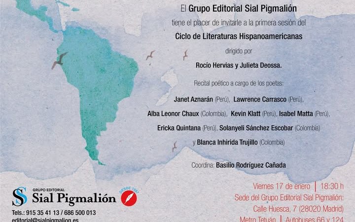 El próximo viernes 17 de enero a las 18:30 horas, Lawrence Carrasco, poeta de la Editorial Ultramarina Cartonera & Digital, participará en la primera sesión del Ciclo de Literaturas Hispanoamericanas organizado por el Grupo Editorial Sial Pigmalión.