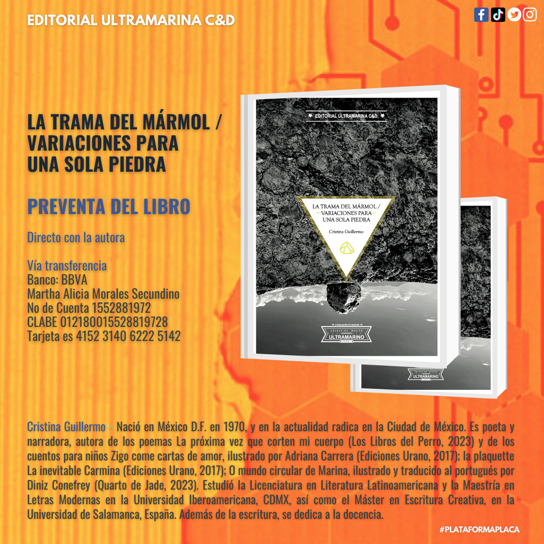 La Editorial Ultramarina Cartonera & Digital tiene el honor de anunciar la preventa exclusiva de los poemarios La trama del mármol / Variaciones para una sola piedra, de Cristina Guillermo. Esta obra, que fusiona la fuerza de la palabra poética con una narrativa intimista, está disponible directamente en preventa.