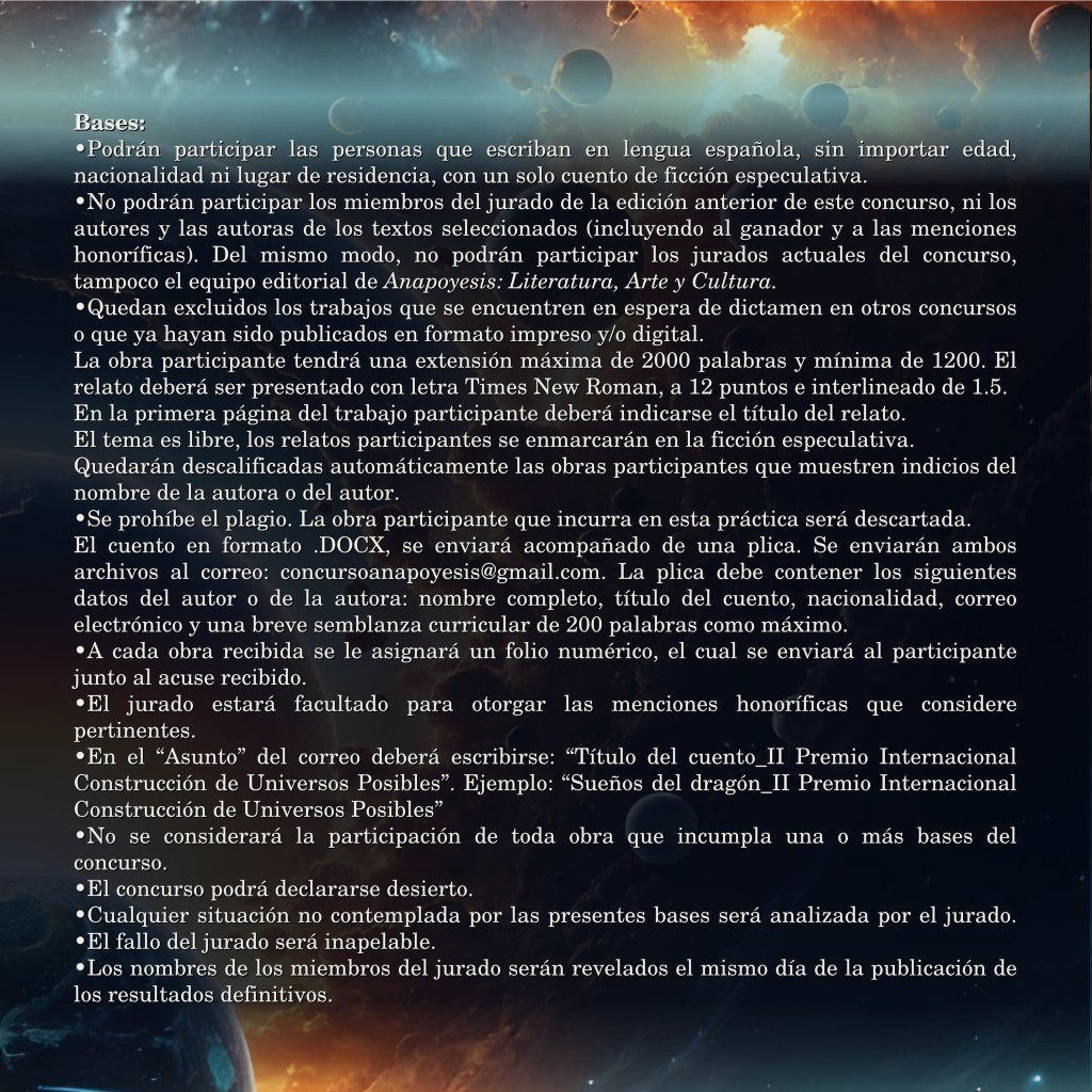 🌌 Anapoyesis lanza su II Premio Internacional de Cuento Breve de Ciencia Ficción: «Construcción de Universos Posibles». Una convocatoria que celebra la creatividad y el talento literario en el género especulativo.