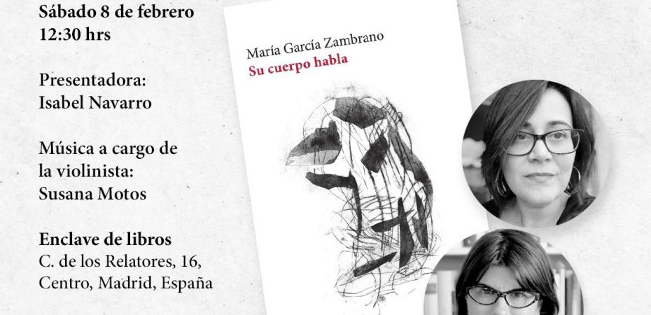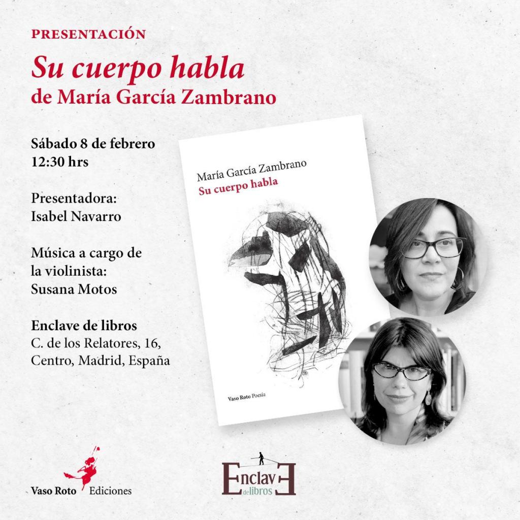 Mañana, sábado 8 de febrero, la librería Enclave de Libros en Madrid será el escenario de la presentación de Su cuerpo habla, el nuevo poemario de María García Zambrano, publicado por Vaso Roto Ediciones. Este evento especial comenzará a las 12:30 hrs y contará con la presencia de Isabel Navarro como presentadora y un toque musical a cargo de la violinista Susana Motos, quien aportará una atmósfera única al encuentro.