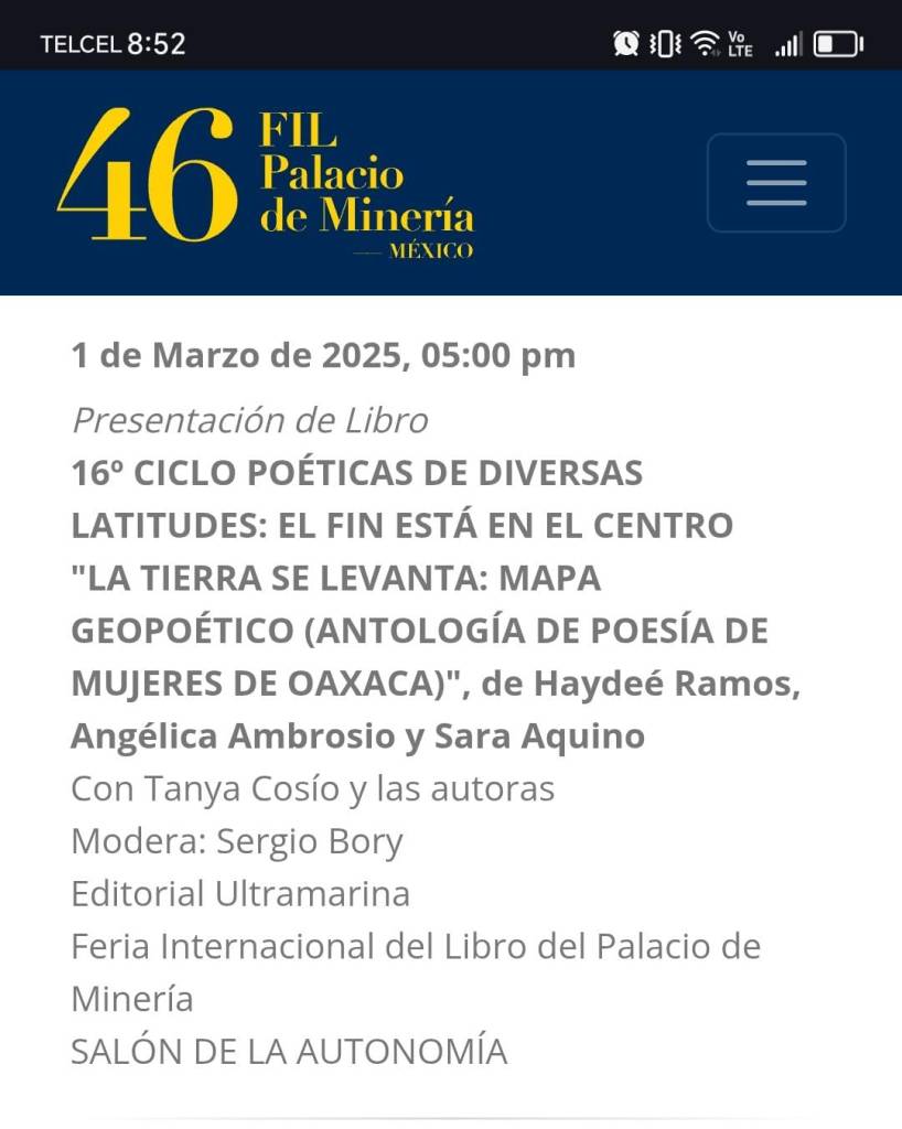 En el marco de la 46 Feria Internacional del Libro del Palacio de Minería, se presentará la antología La tierra se levanta: Mapa geopoético, una obra que reúne las voces de Haydeé Ramos, Angélica Ambrosio y Sara Aquino, y que ha sido editada por Editorial Ultramarina C&D dentro de su colección dedicada a la vinculación de mundos.