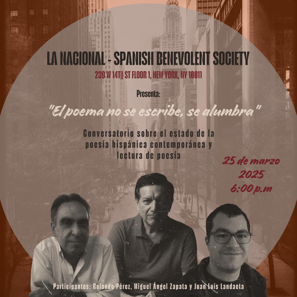 La poesía hispánica contemporánea tiene un espacio de reflexión y celebración este 25 de marzo en La Nacional – Spanish Benevolent Society (Nueva York). Bajo el título «El poema no se escribe, se alumbra», tres voces fundamentales de la poesía y el pensamiento en español se reunirán en un conversatorio sobre el estado actual de la poesía hispánica contemporánea, seguido de una lectura de poesía.