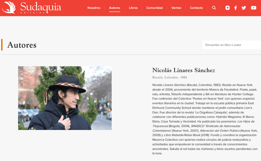 📚 Nicolás Linares es un poeta, editor y gestor cultural colombiano radicado en Nueva York. Su obra atraviesa el territorio de la diáspora, la resistencia poética y la exploración de la identidad en contextos migratorios. Como coordinador de Poetas en Nueva York, ha trabajado incansablemente en la visibilización de escritores latinoamericanos en Estados Unidos. Su inclusión en Sudaquia refuerza la importancia de su trabajo dentro de la literatura de la movilidad y la pertenencia.