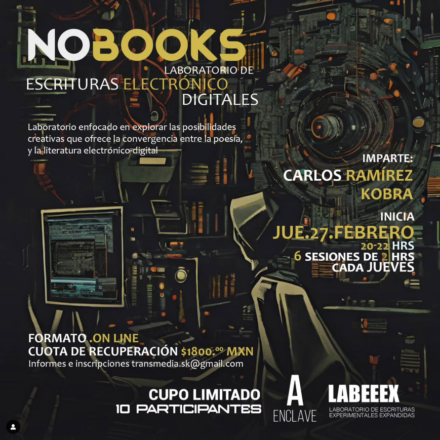 El LAB NoBOOKS, impartido por Carlos Ramírez Kobra y organizado por Lab EEE X, es un espacio diseñado para la exploración de nuevas narrativas digitales a través de herramientas como Web3, blockchain, literatura audiovisual, arte generativo y narrativas interactivas. Este laboratorio ofrece un acercamiento innovador a la literatura expandida, donde la escritura dialoga con la tecnología para generar experiencias inmersivas.