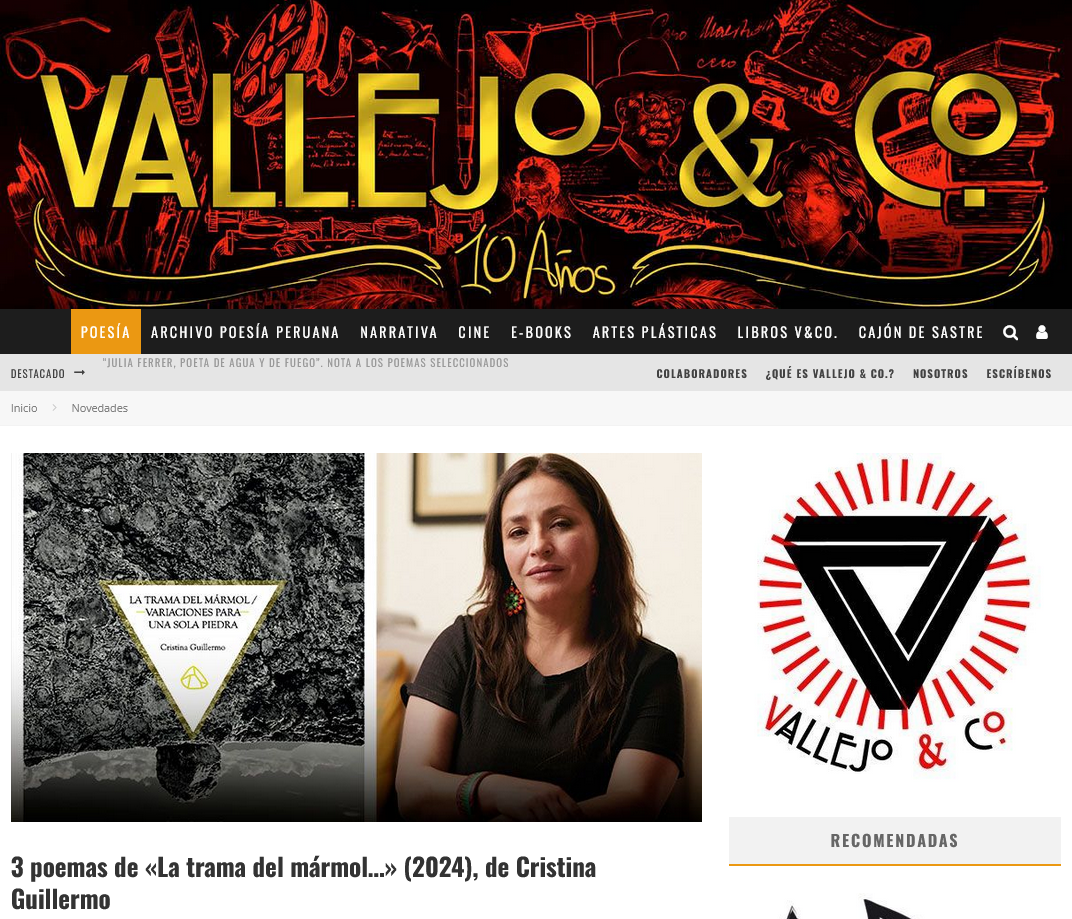 La prestigiosa revista literaria Vallejo & Co ha publicado tres poemas de La trama del mármol / Variaciones para una sola piedra de Cristina Guillermo, una obra que explora la memoria, la materia y el lenguaje a través de la poesía. Con esta publicación, el libro sigue consolidándose como un referente en la poesía contemporánea, estableciendo un diálogo entre la tradición y la experimentación literaria.